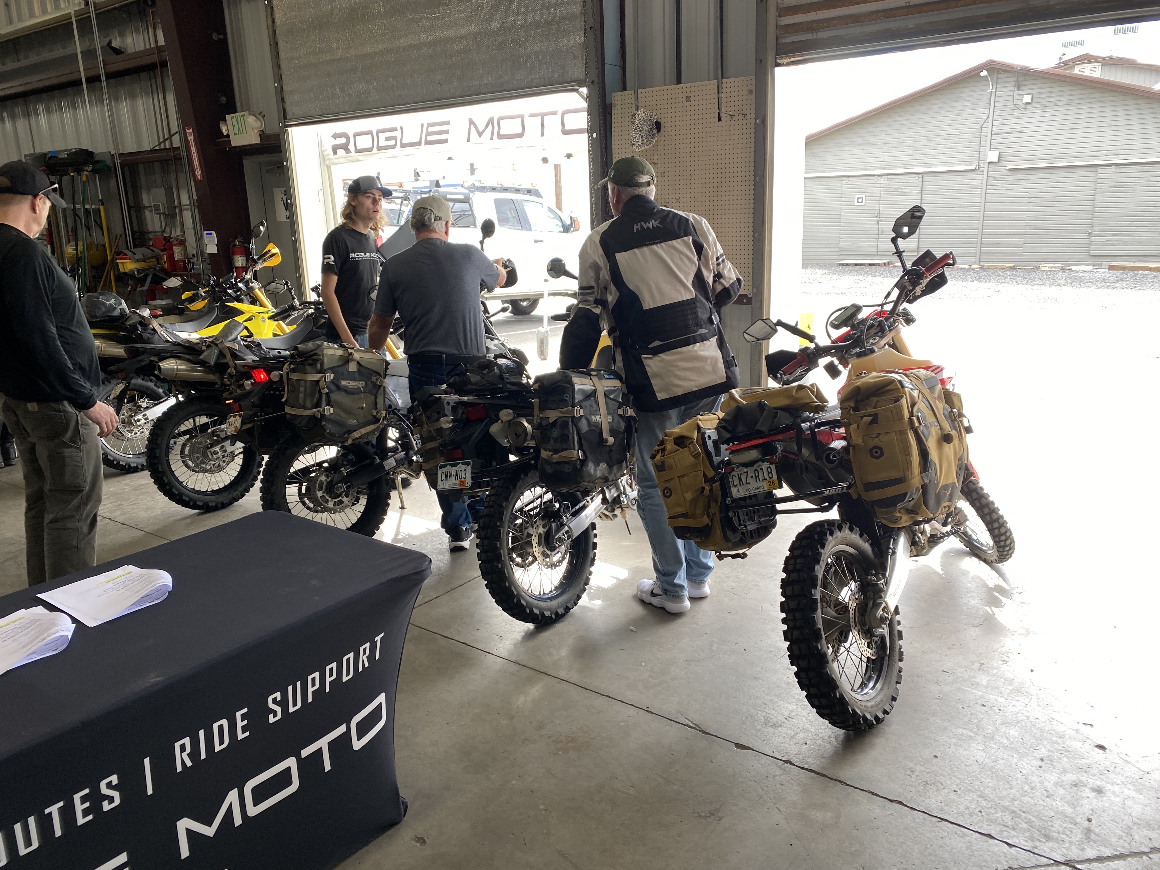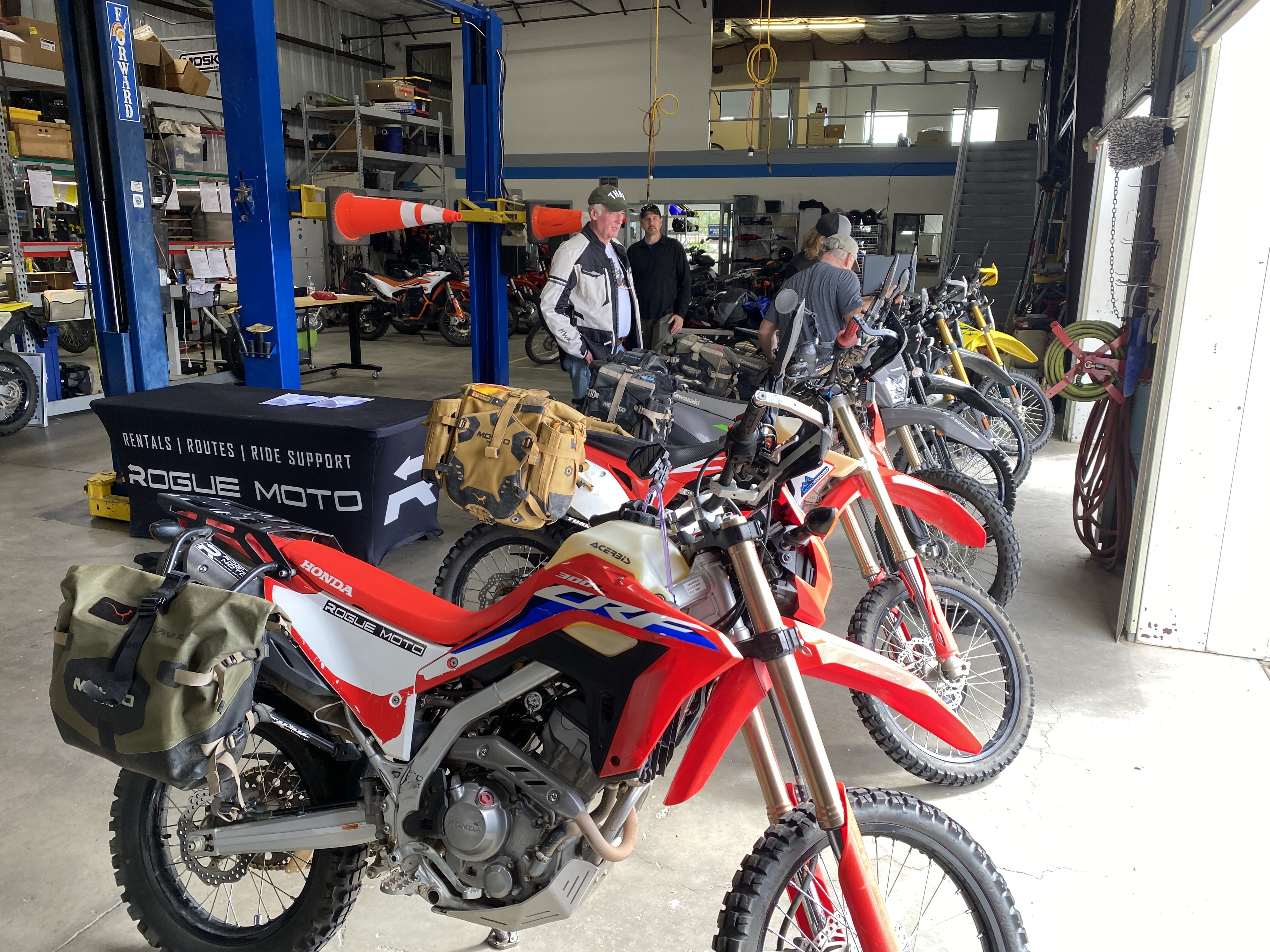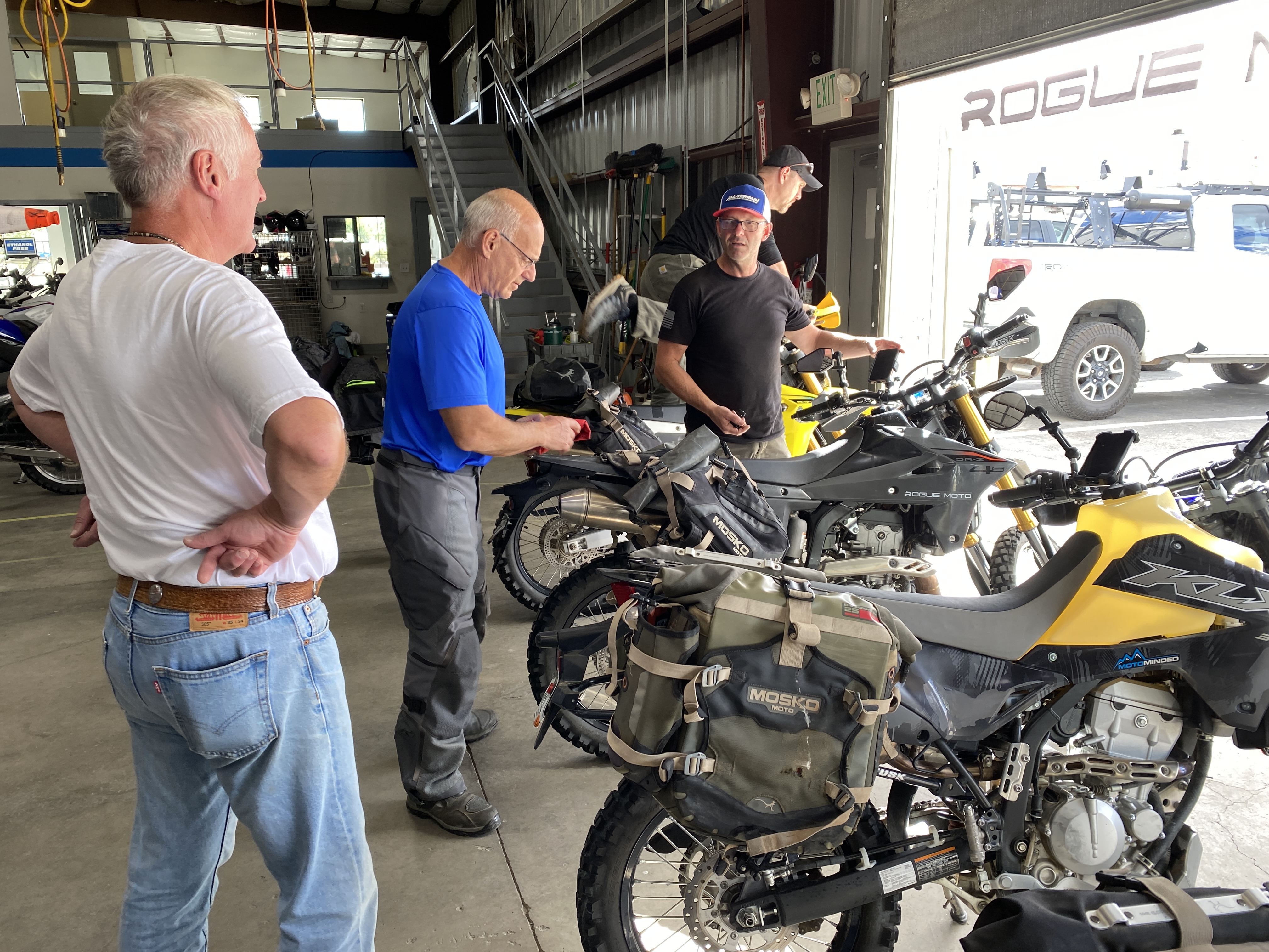 Alex at Rogue Moto picked us up at our hotel and drove us to his shop. There we added the last few bits of luggage etc to the bikes. We also put together our tool kit including inner tubes and tire pumps. We are well provisioned. Here are a few pictures at Alex's shop.