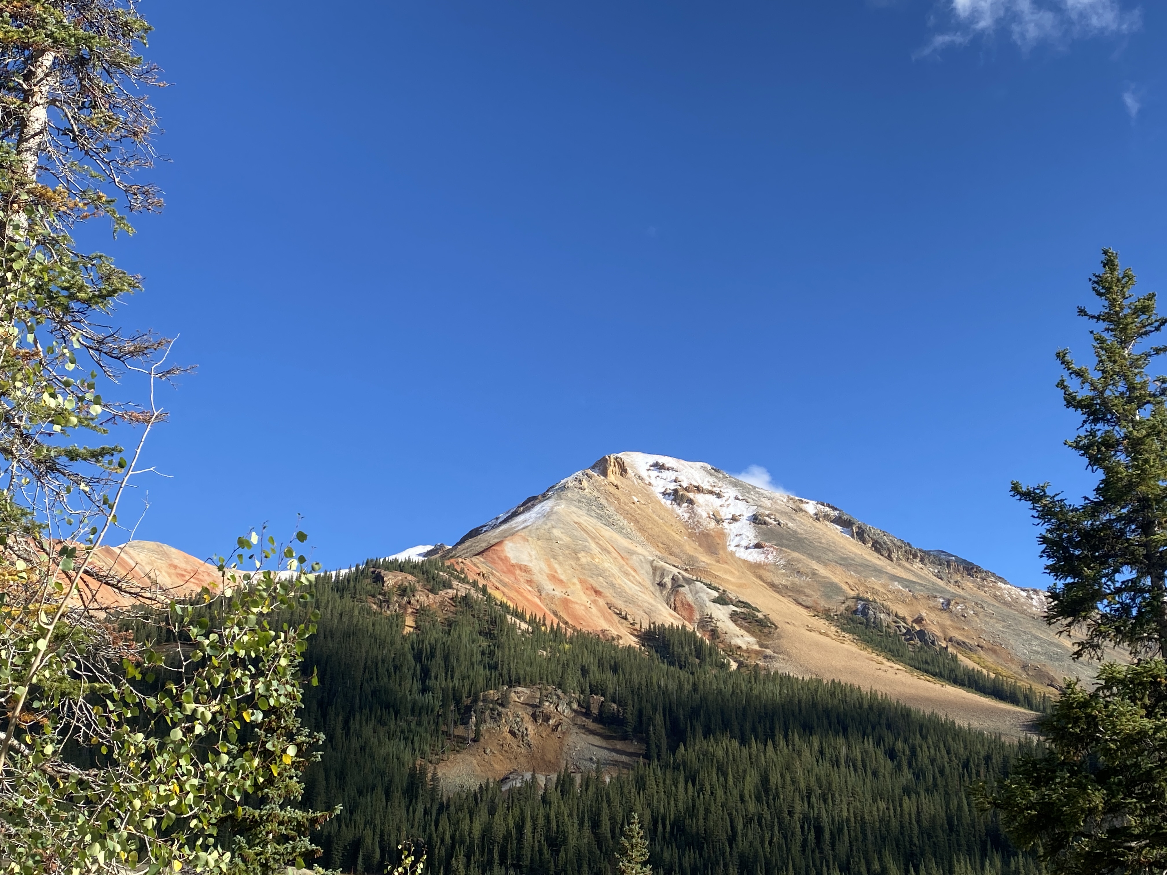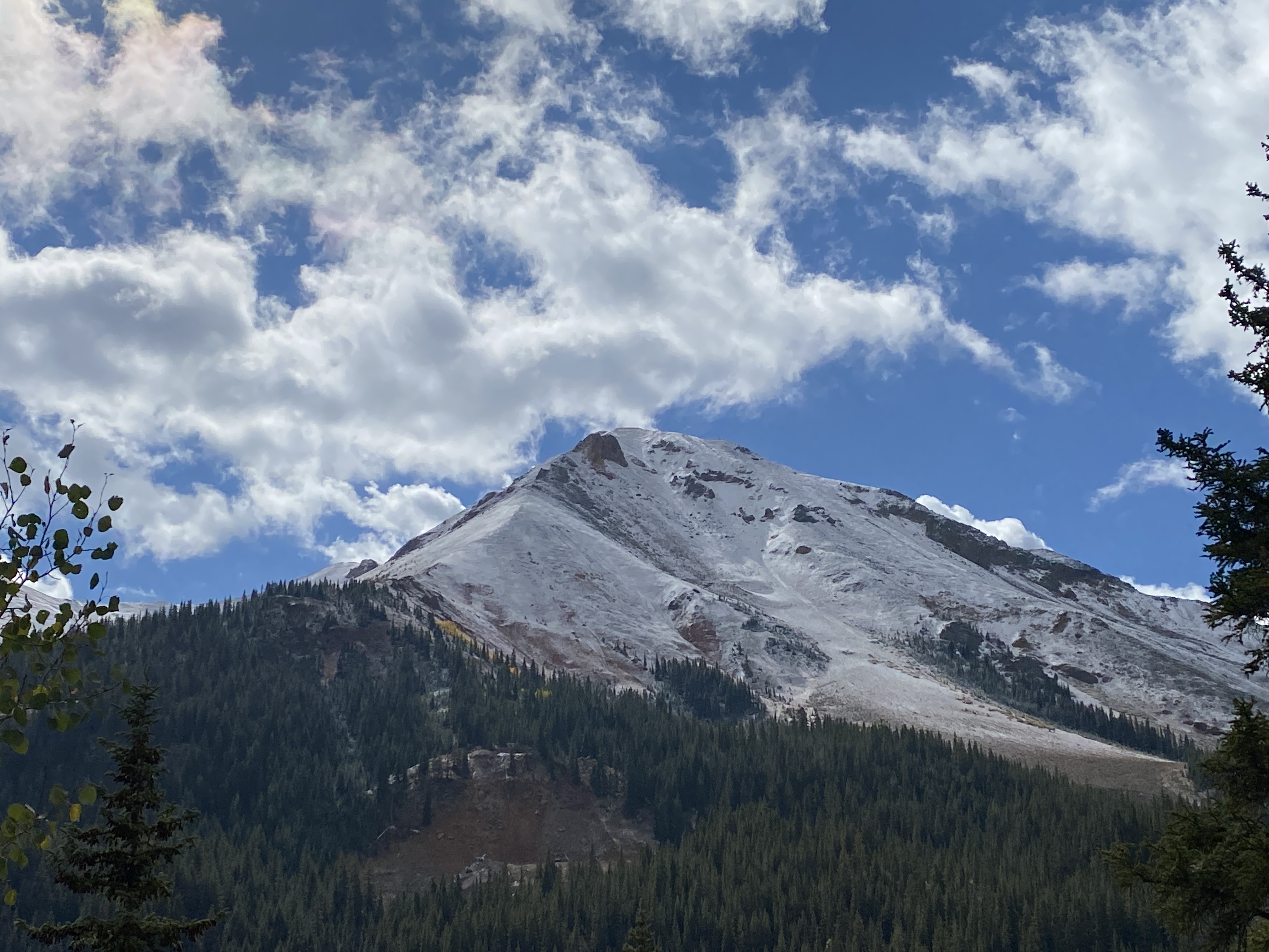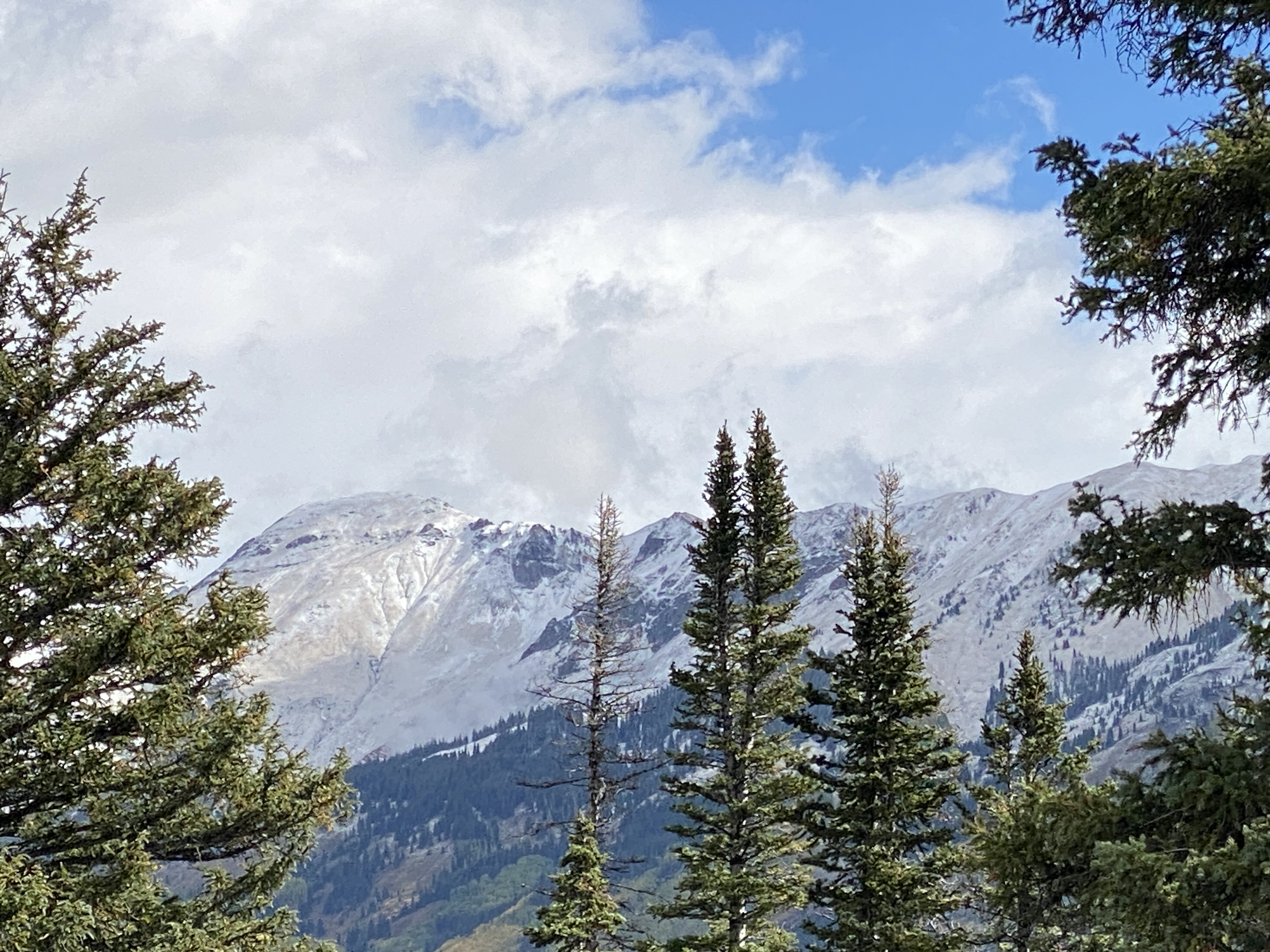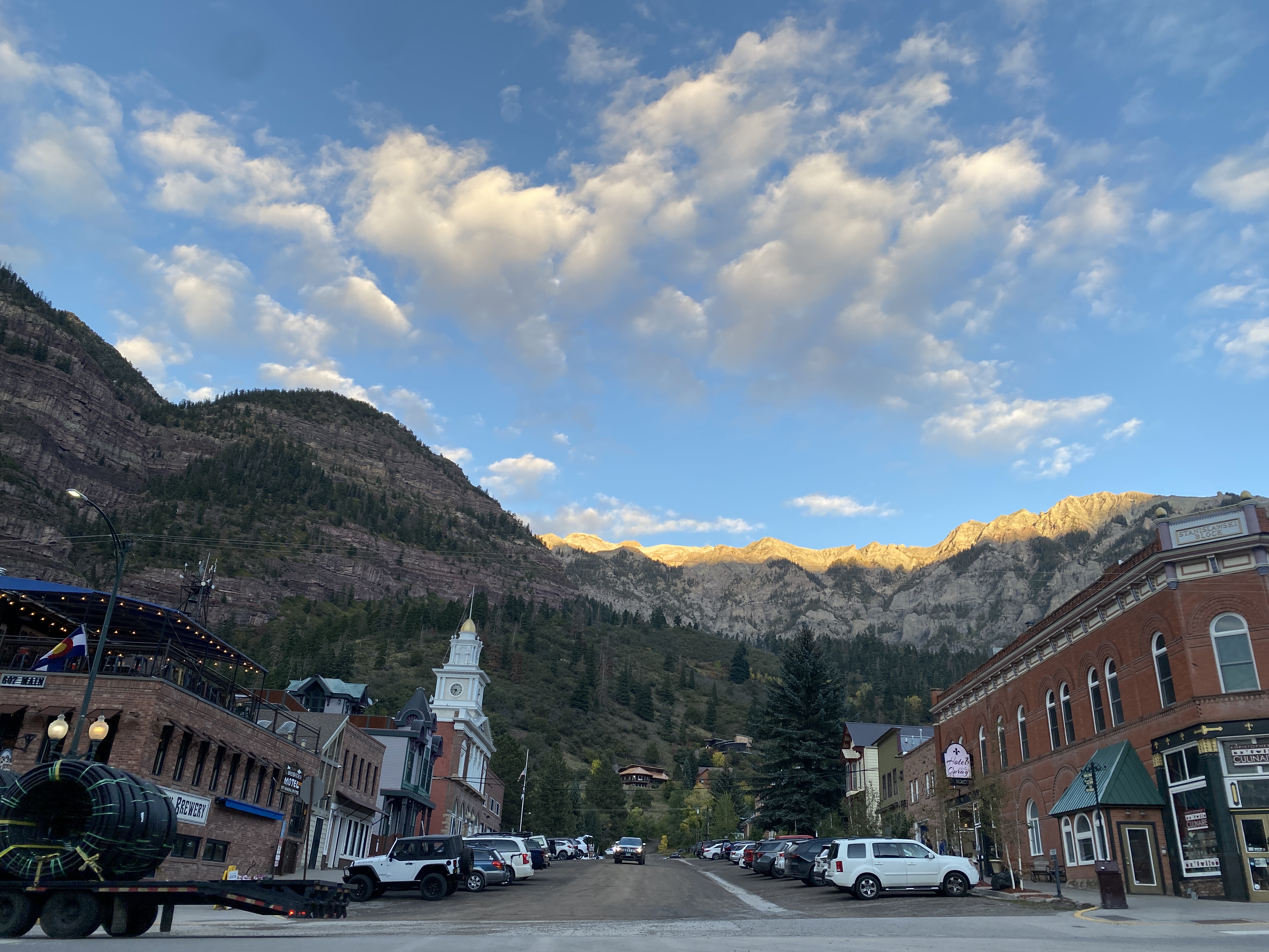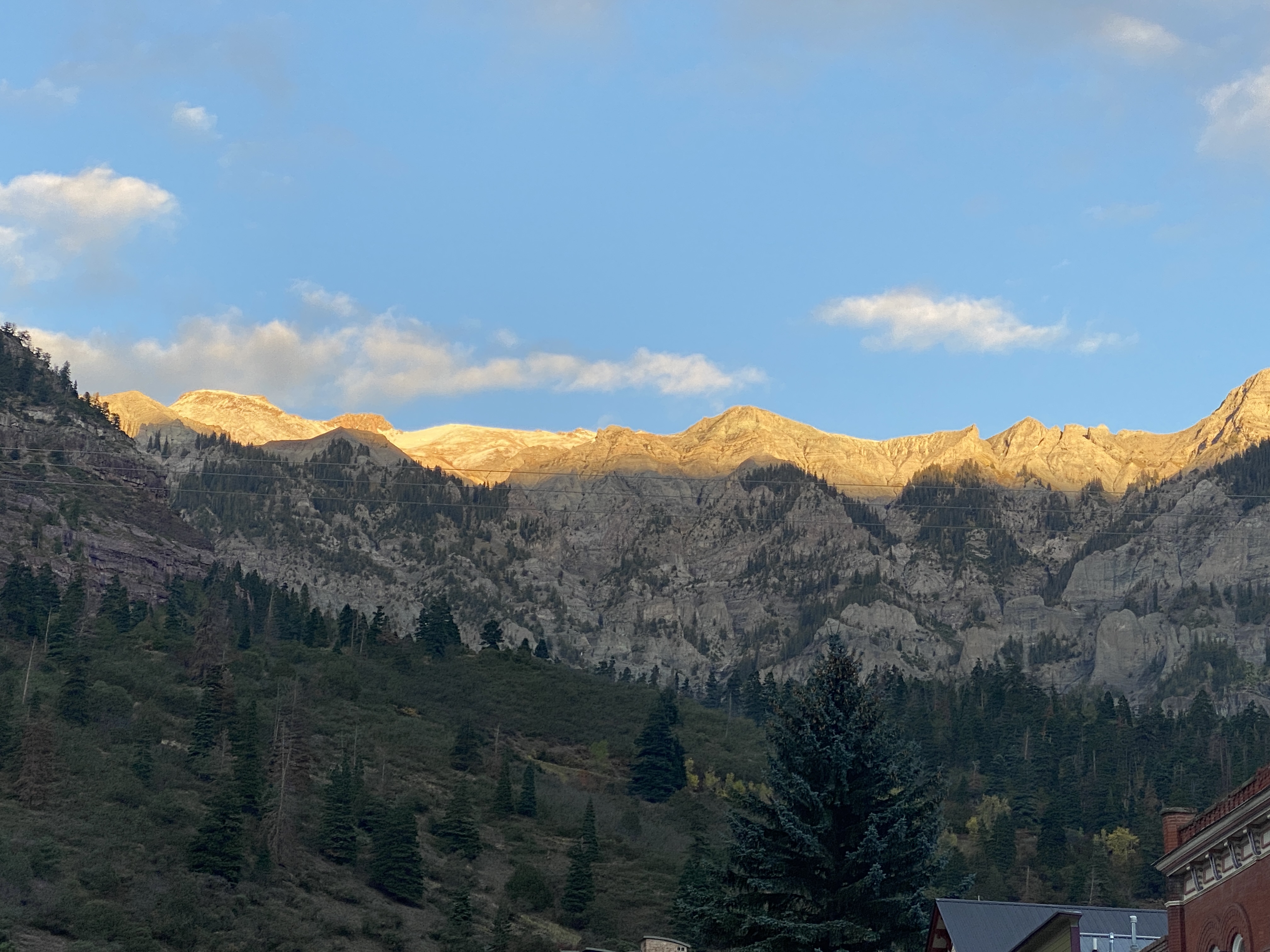 Here we are back in Ouray. The sun is lighting up the peaks gold and there is a bit of snow visible at the top.