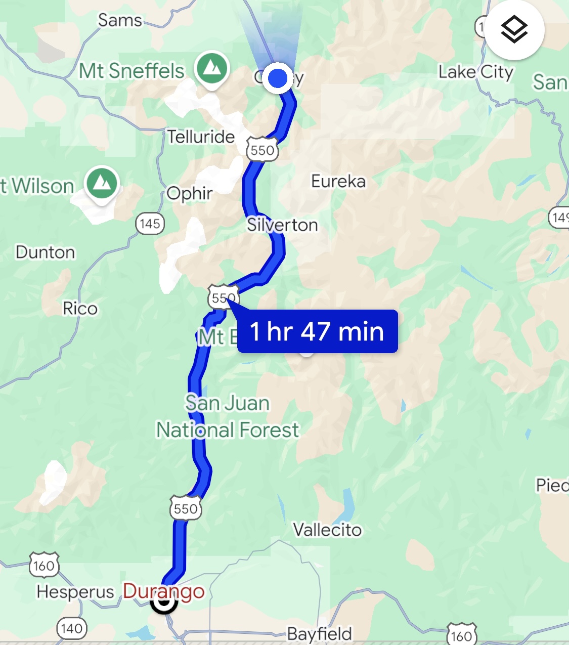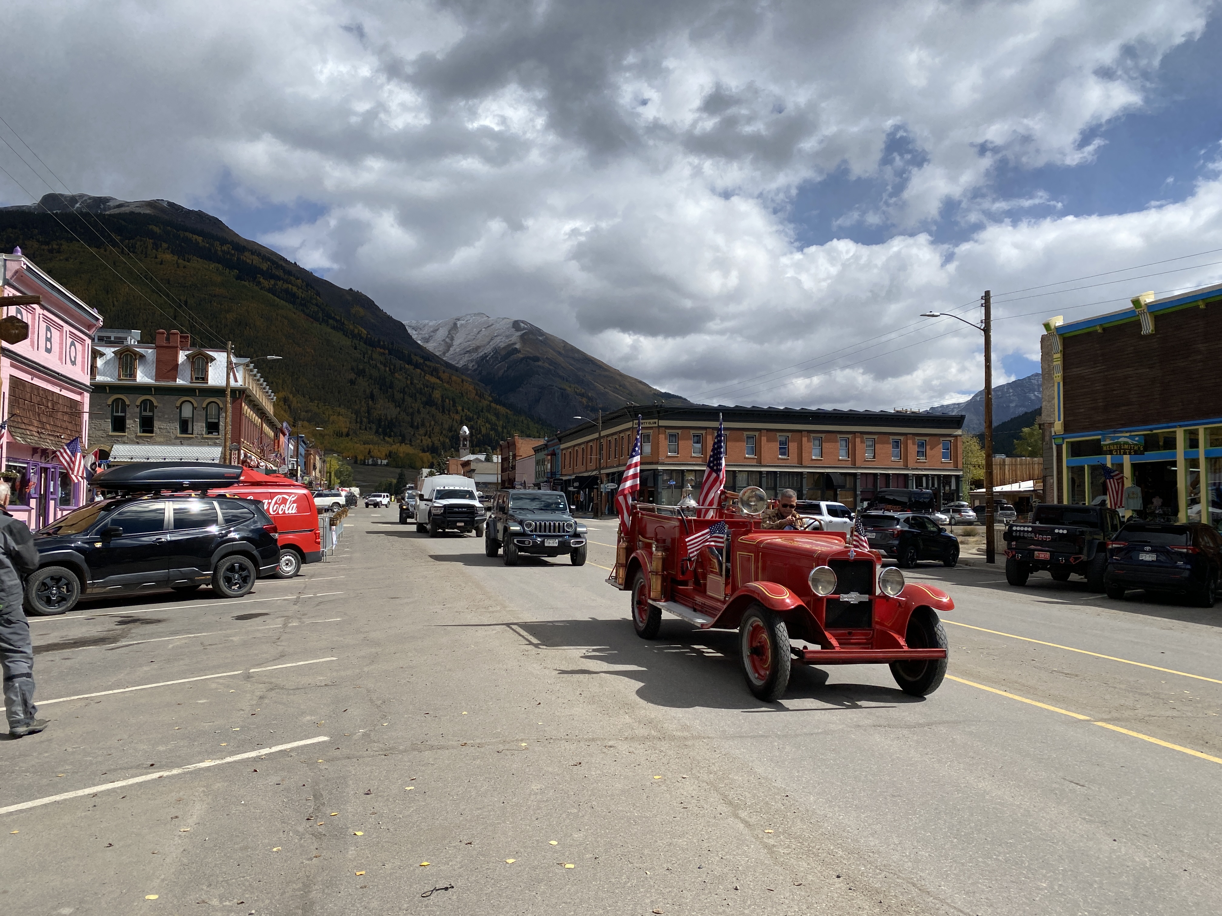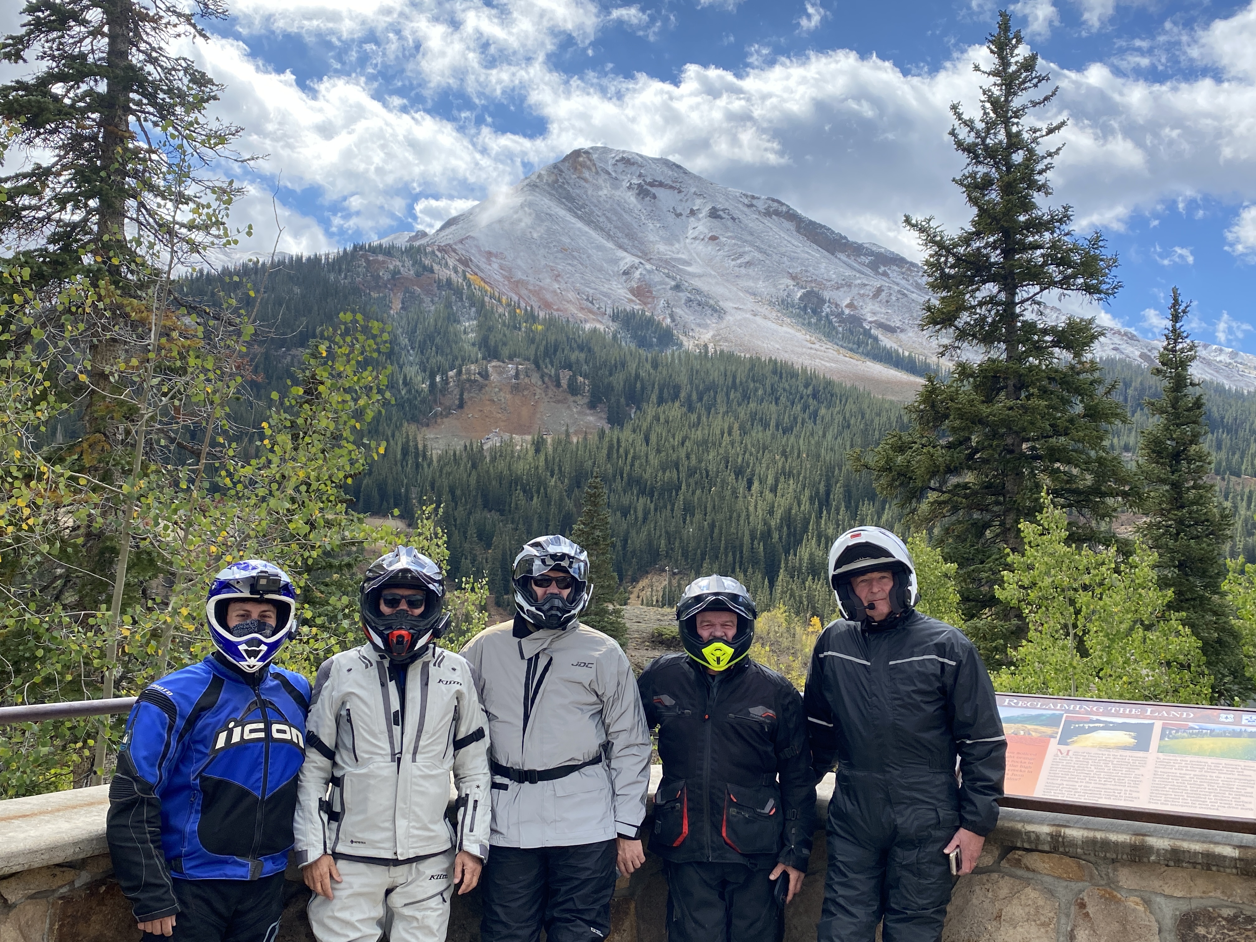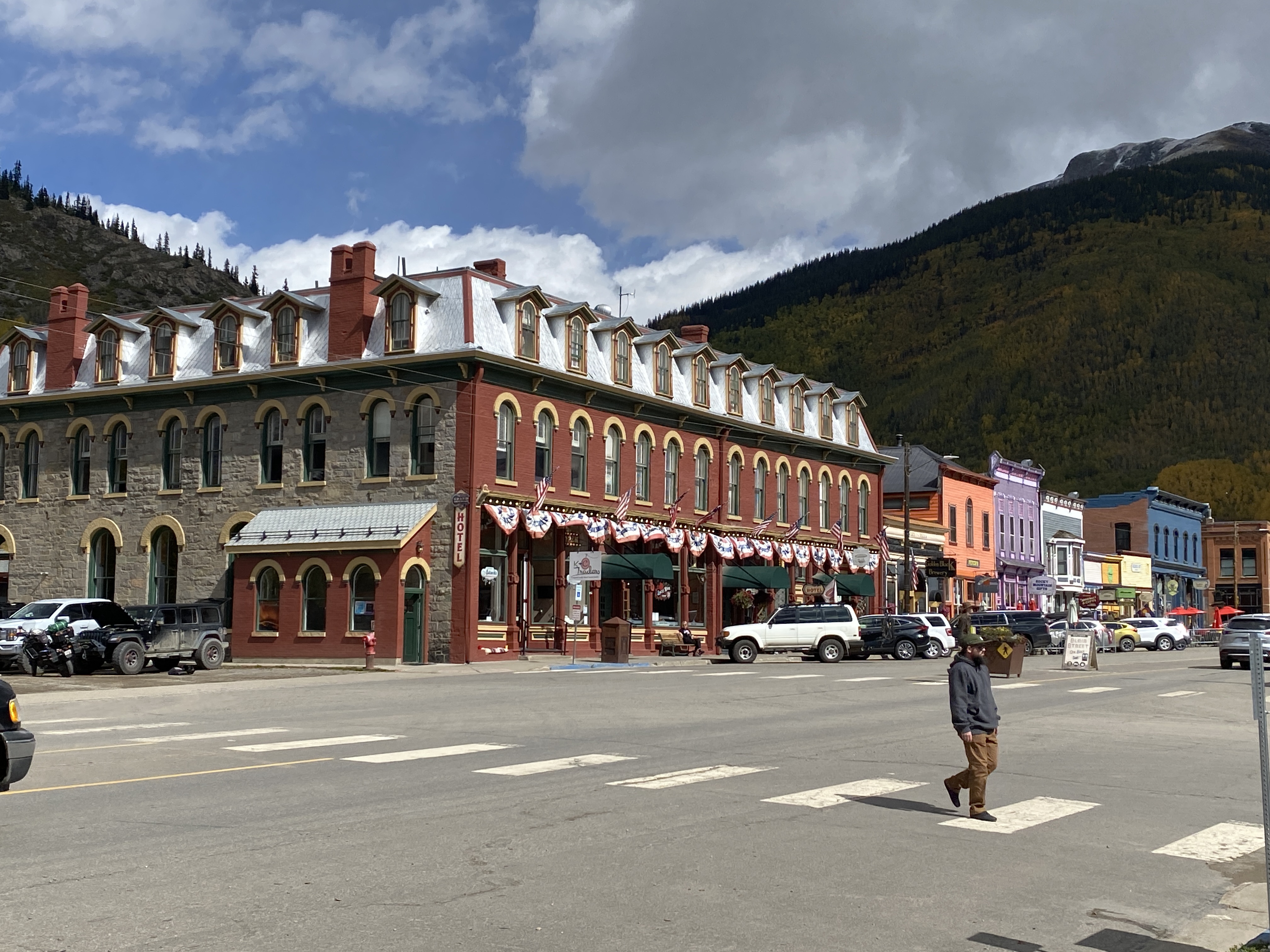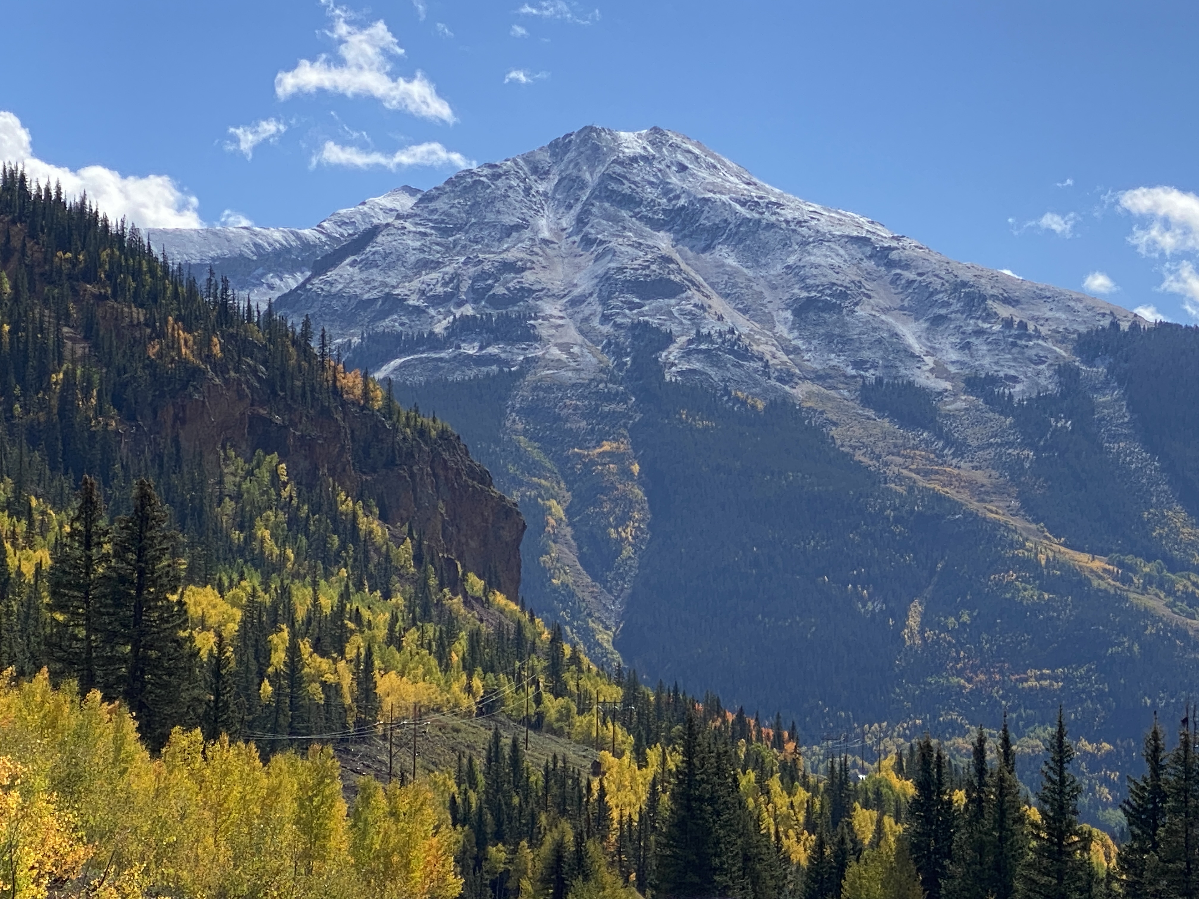 So we came up with a plan B, which was an all pavement day, out the Million Dollar Highway, through Silverton, and then on to Durango for lunch, and then back to Ouray. It turned out to be a beautiful day. There was some rain in the morning but it stopped by the time we headed out, and as the day progressed we got more sun. There were mountainsides with amazing yellow colors of aspens. It was a beautiful ride.