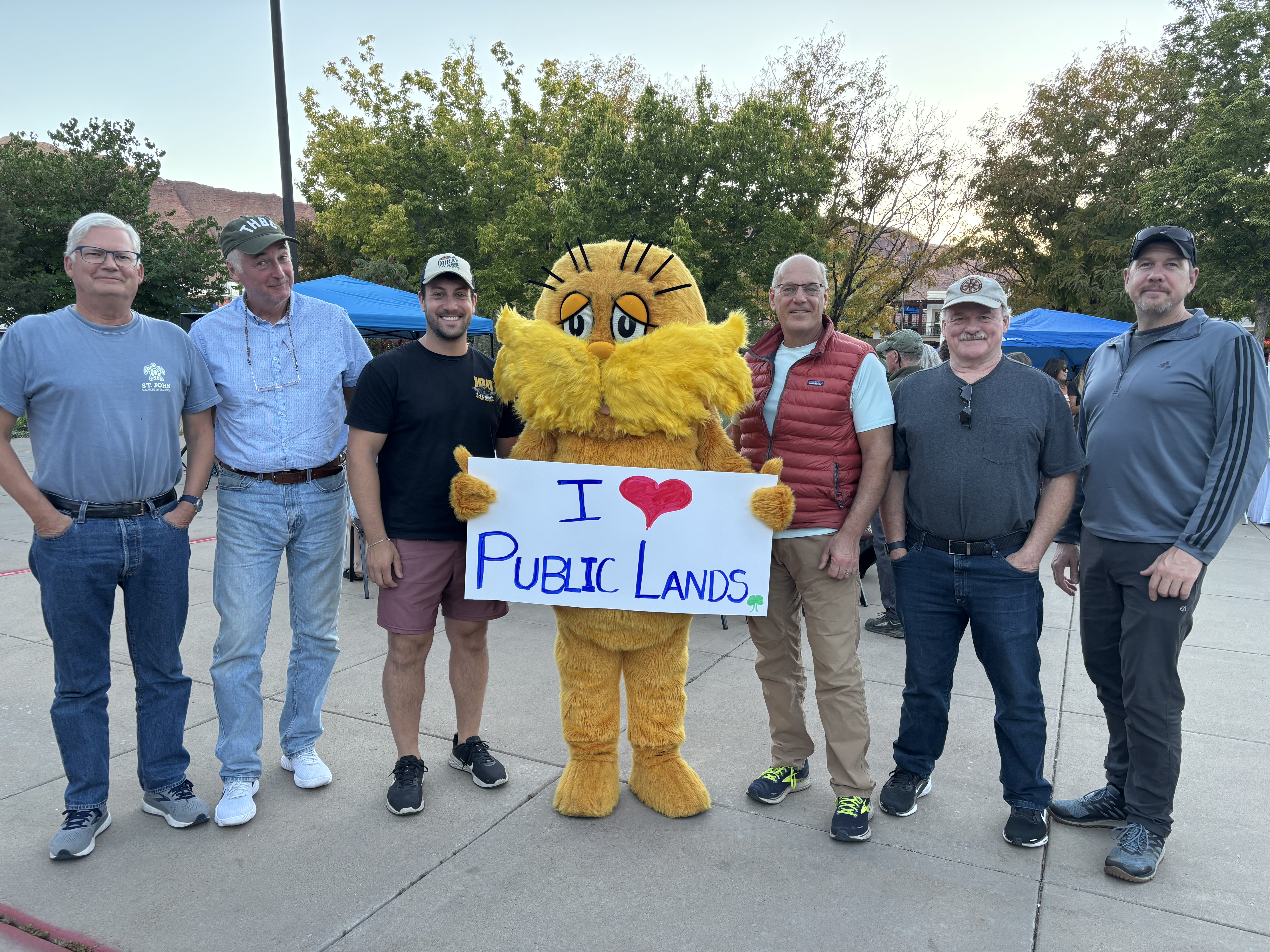 After the dip in the Colorado it was only about 15 miles back to Moab. We showered and then headed out for an early dinner. After dinner we noticed something happening across the street at the visitors center. It was a gathering to promote and celebrate public lands, such as Arches and Canyon Lands. There were booths, live music, etc. but most importantly there was the Lorax, who kindly posed with all of us.