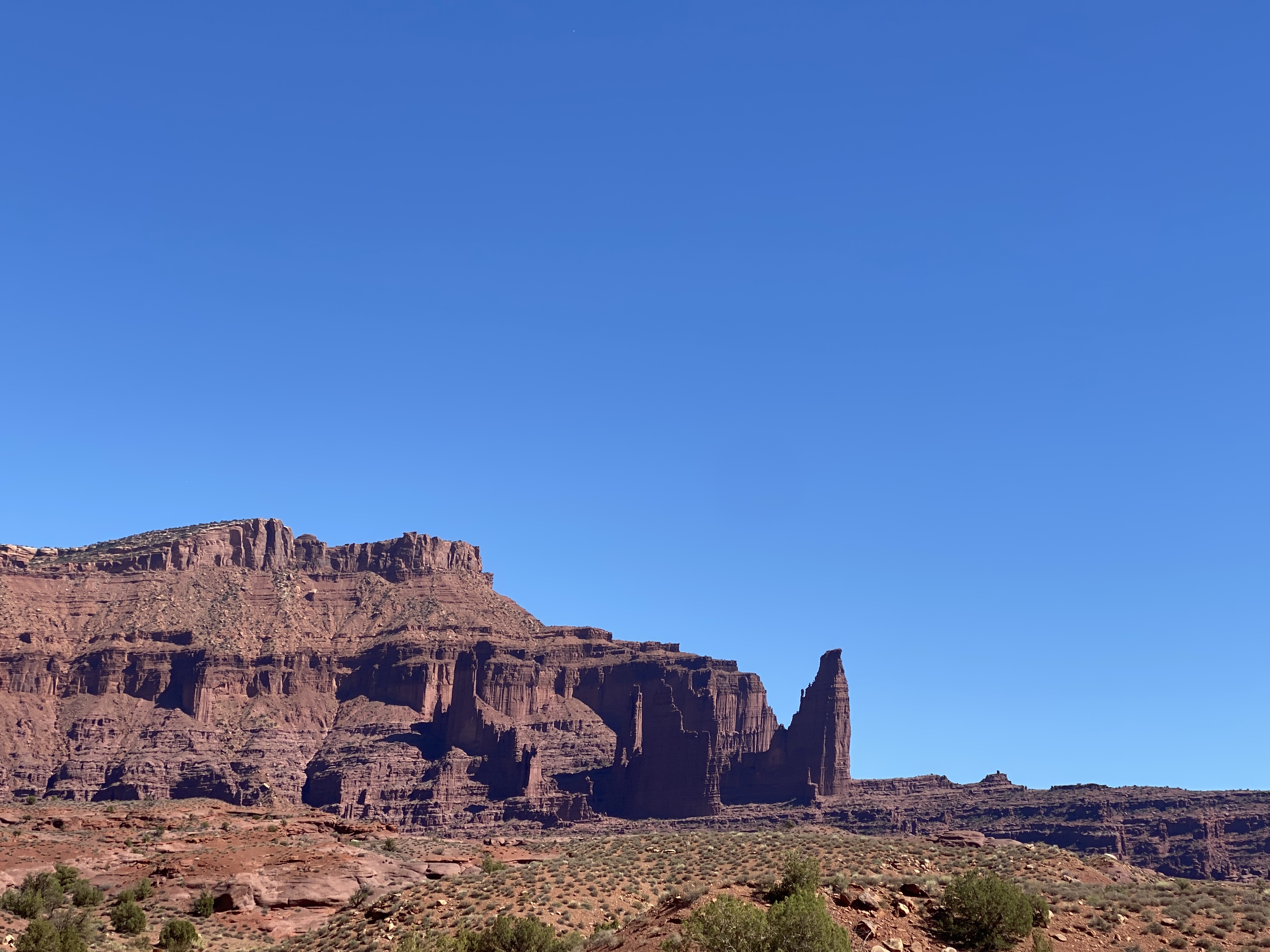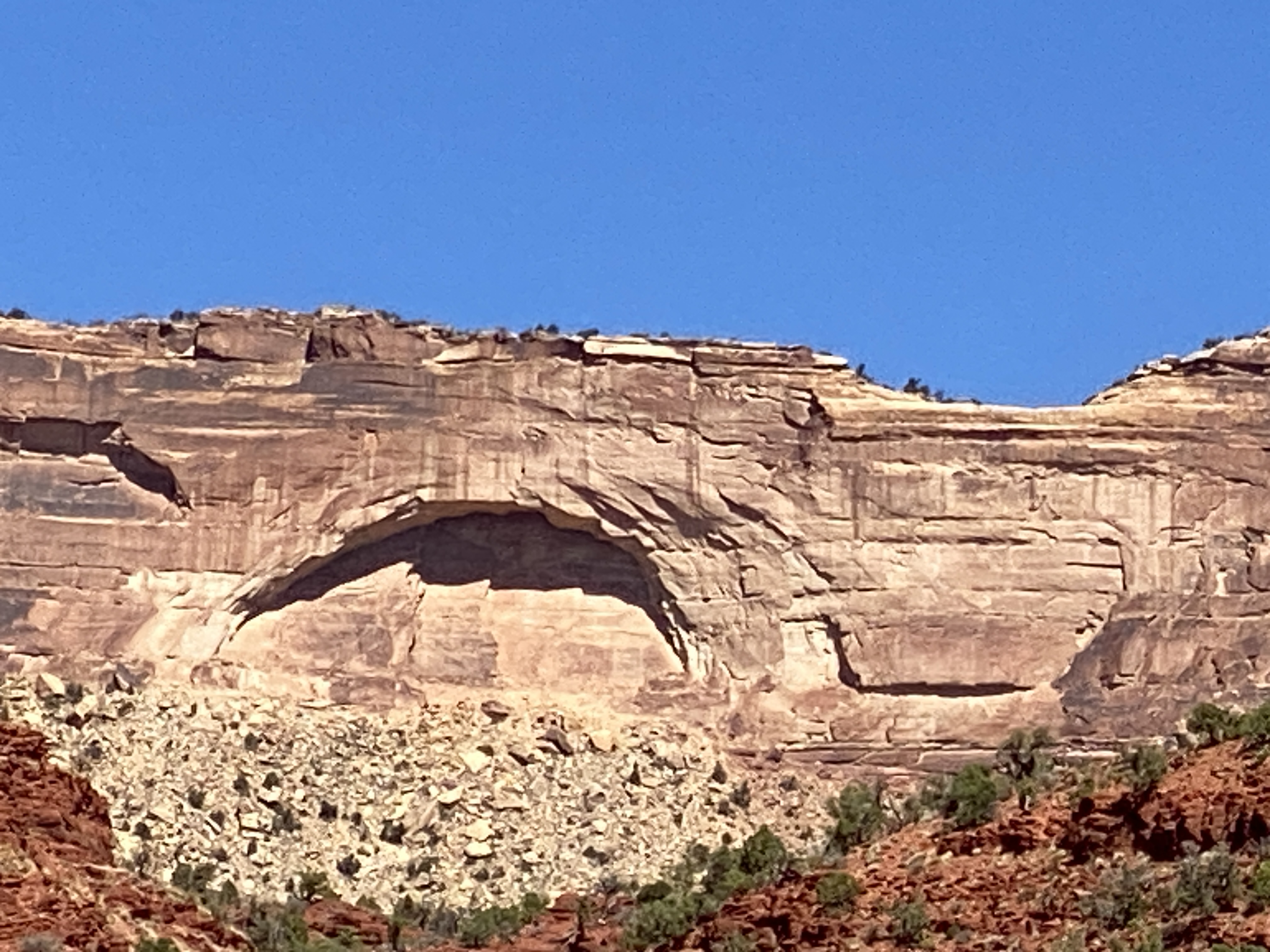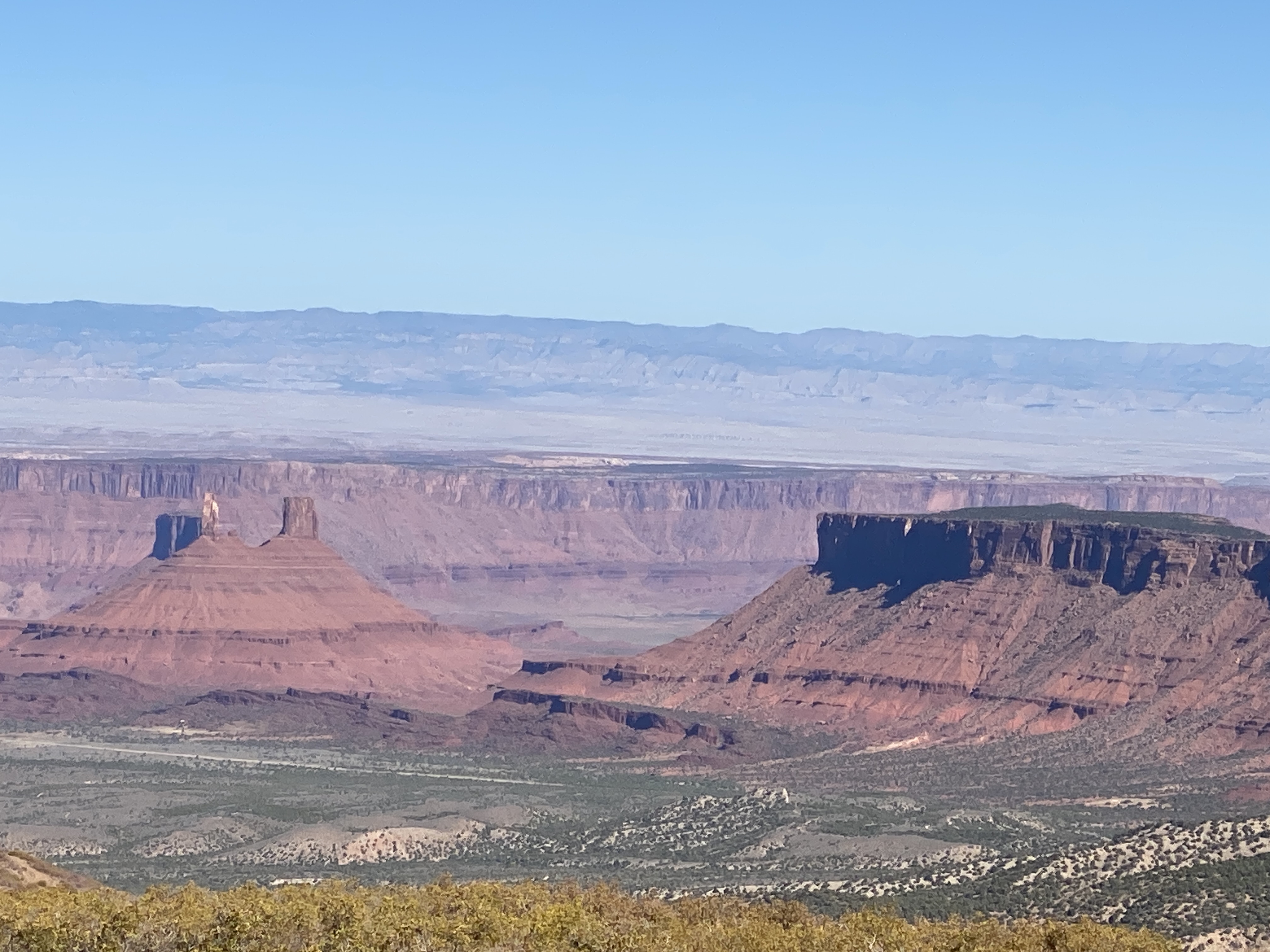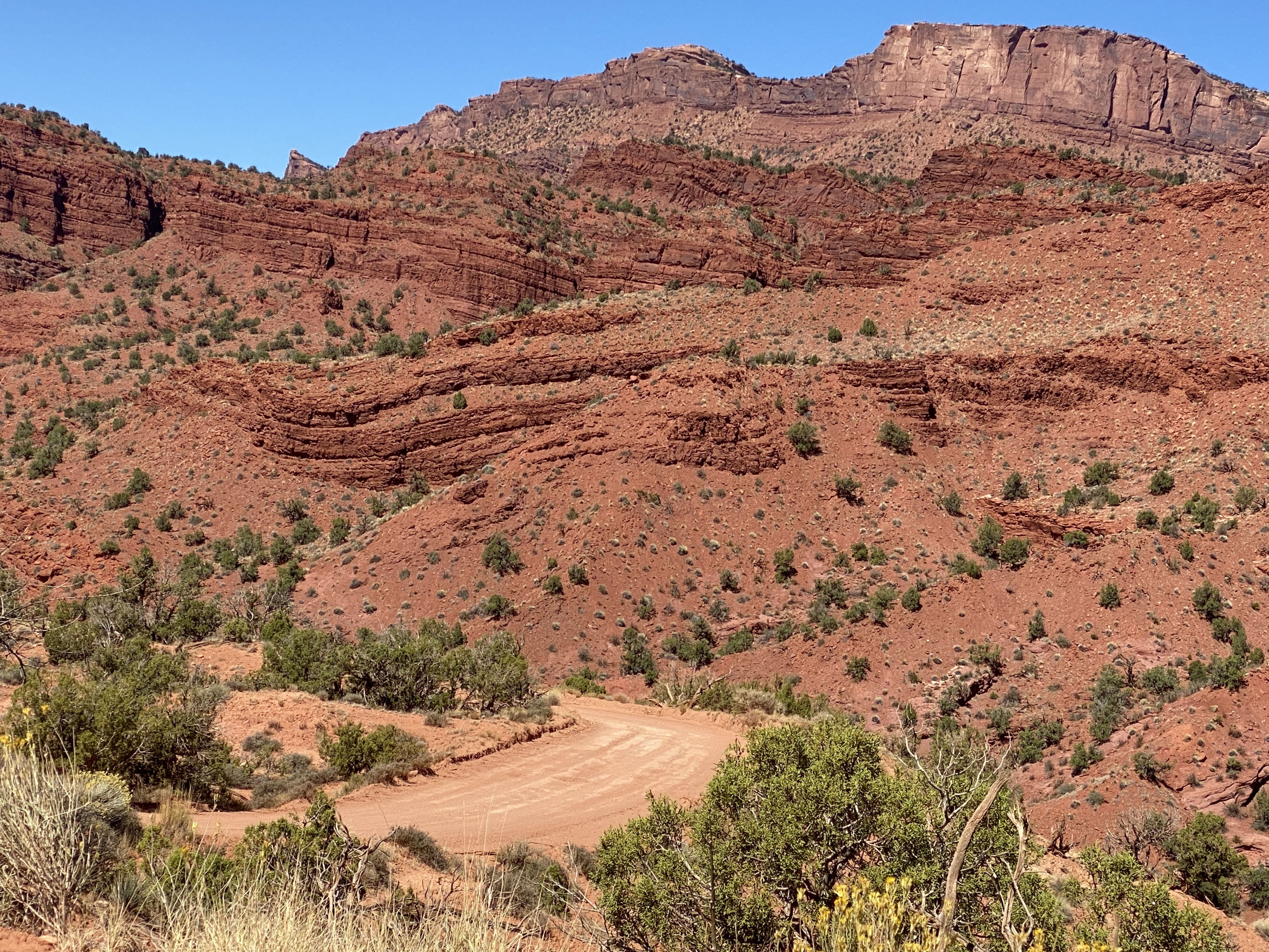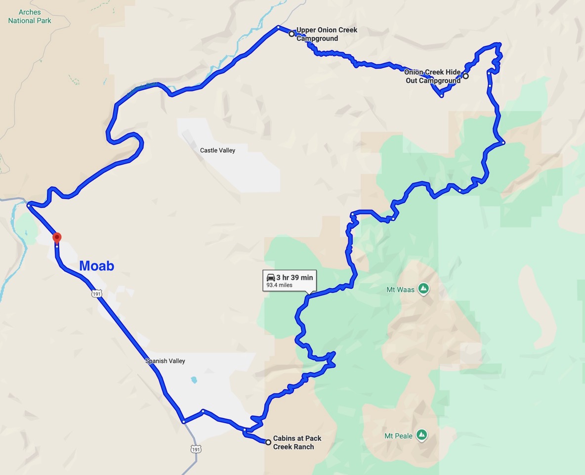 Today was our first of two days in Moab. We got an early start and headed south out of town. There was a road constuction delay and we had to wait for an escort car. The LaSalle Loop was being repaved and they had sprayed tar oil on the asphalt before putting on the second layer. We drove carefully on what might be slippery tar for mile after mile. Finally it ended and we had old asphalt to ride on, up in the mountains east of Moab.
