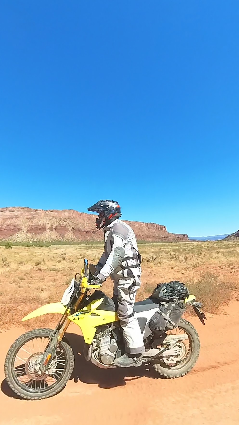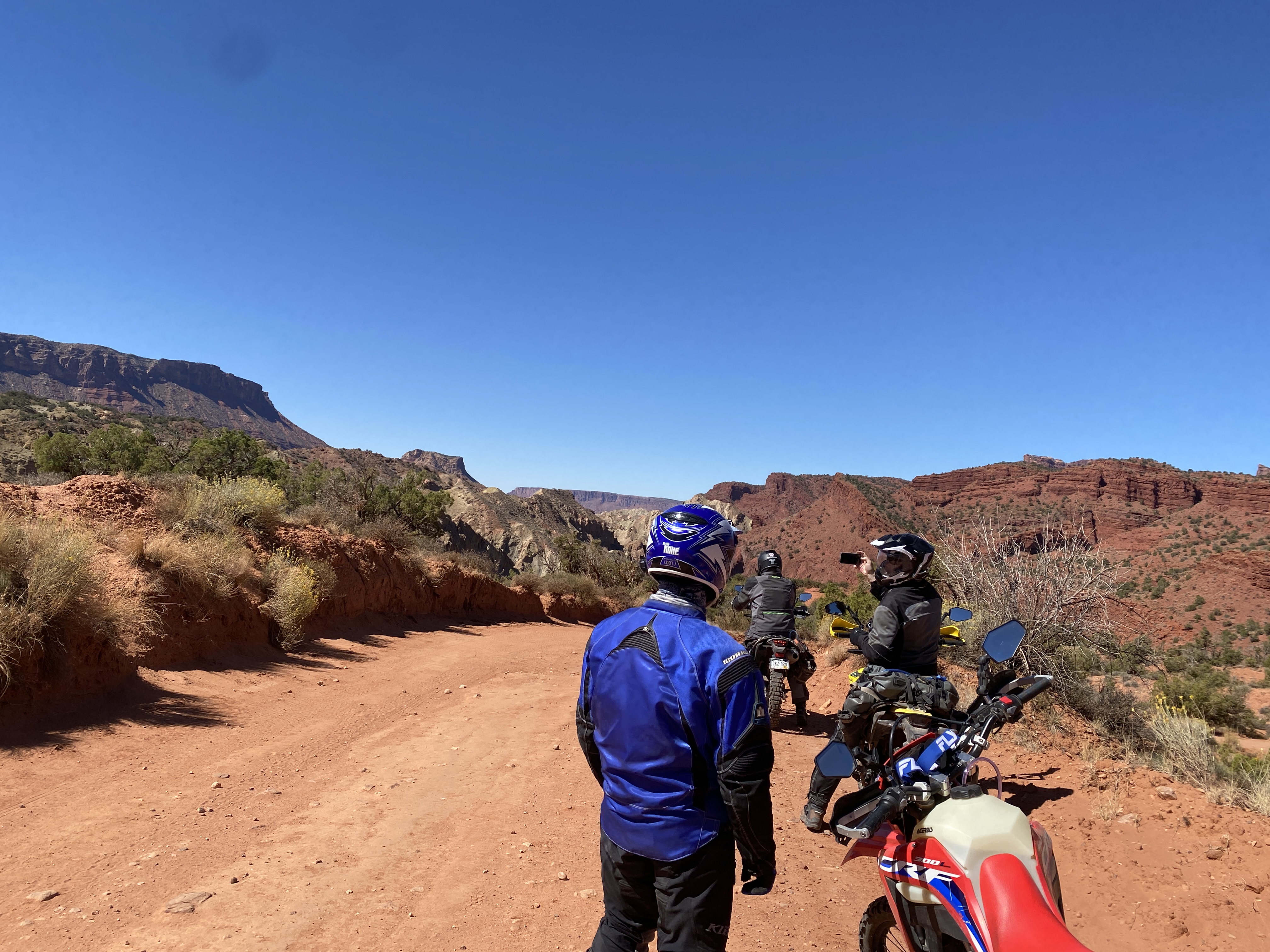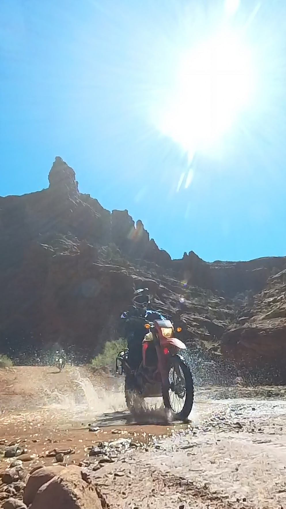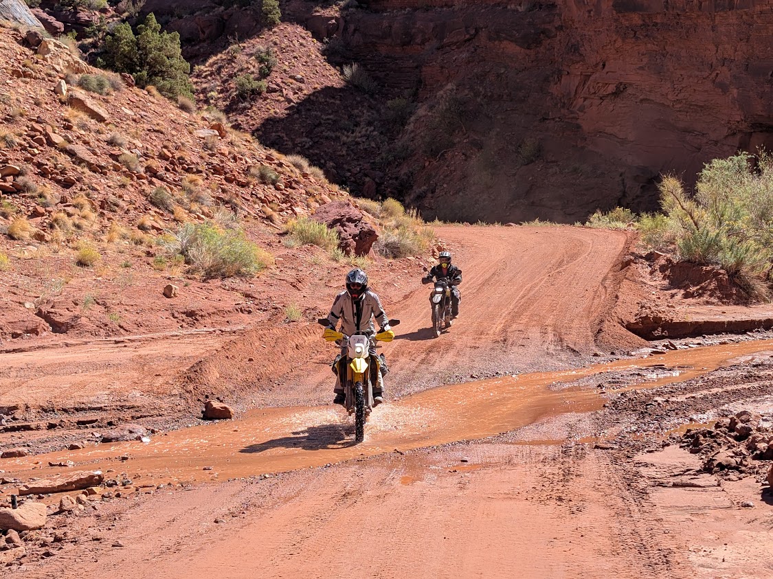 Finally the pavement ended and we started out on a dirt road. This quickly became a Jeep road with very challenging terrain. There were lots of rocks, ledges, and for the first time, deep sand. The riding kept us in our toes and required paying attention and really using our riding skills. However the landscape was beautiful. We road down red rock canyons, had water crossings across a creek about 50 times, and riodr through very interesting terrain. Here are some pictures.