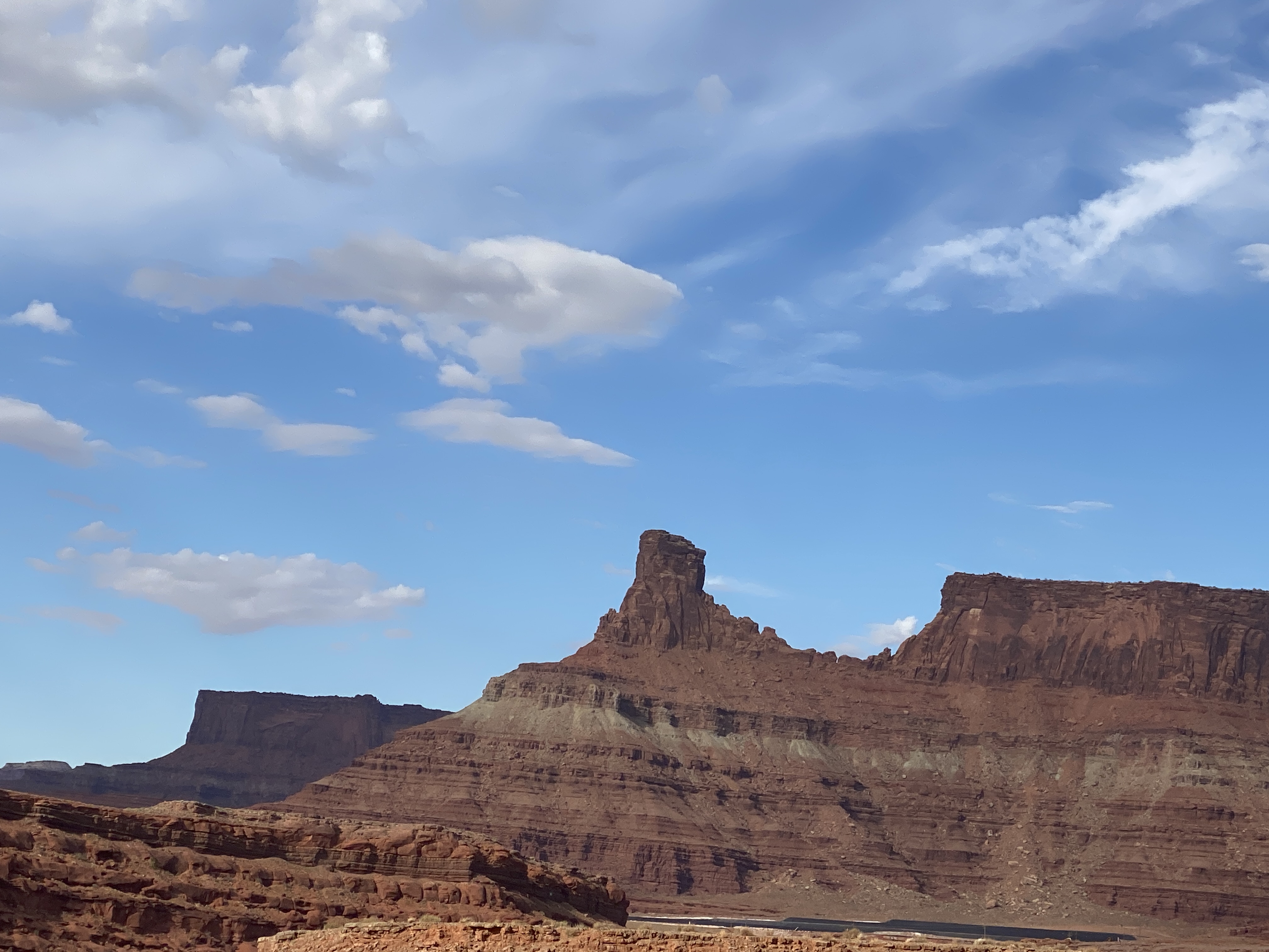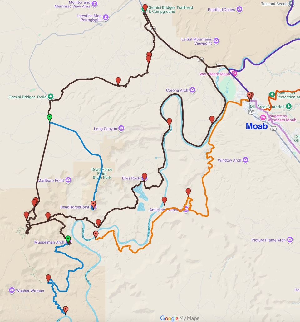 Today we did a loop out from Moab through part of Canyonlands National Park. In the map above we did the loop clockwise out and down along the black route (not the orange track) and then back up the upper black track. We did two "out and backs". The first was out to Musselman Arch, the green pin part way off the main route. The other out and back was to Dead Horse Point, which is the red pin at the end of the blue track pointing down.