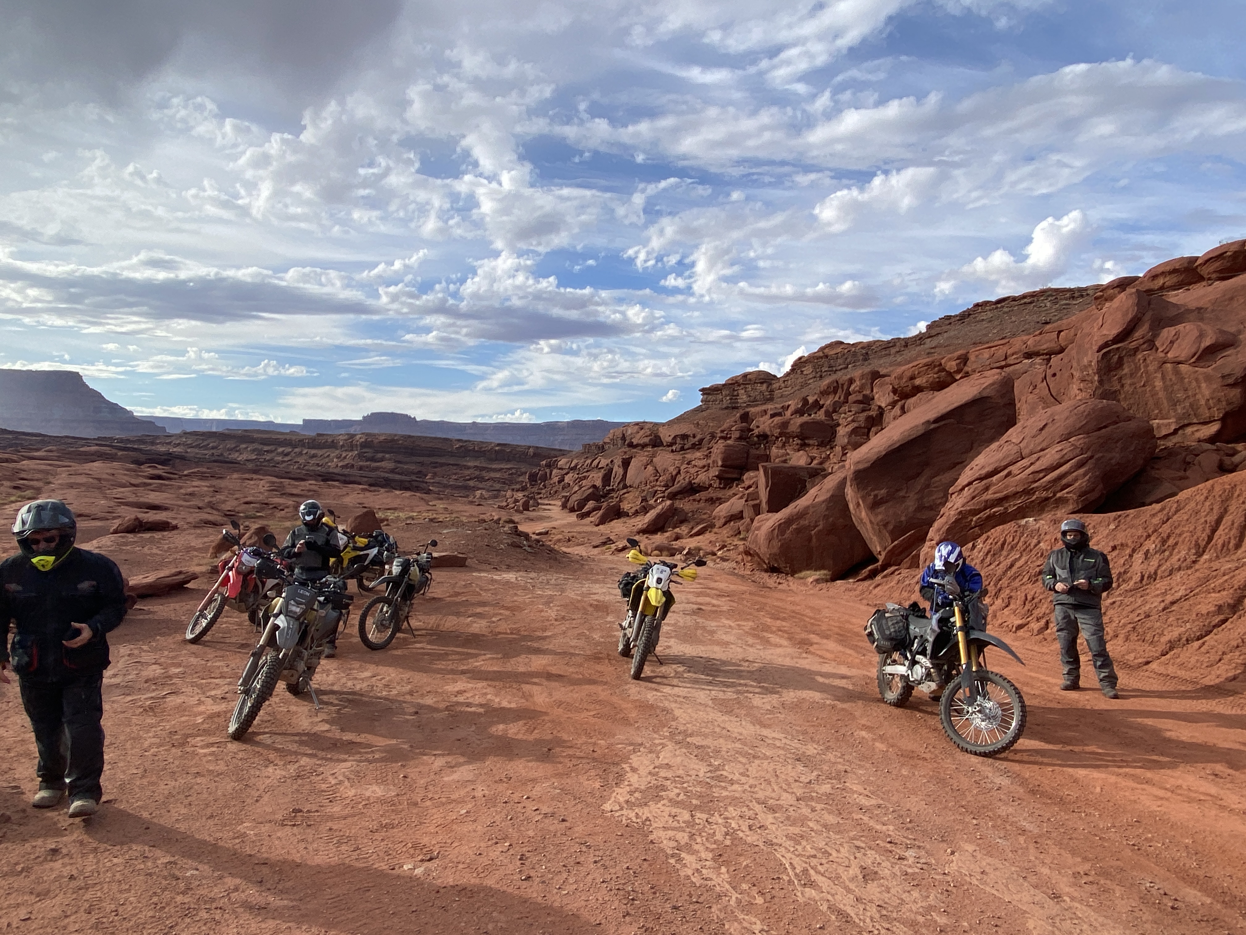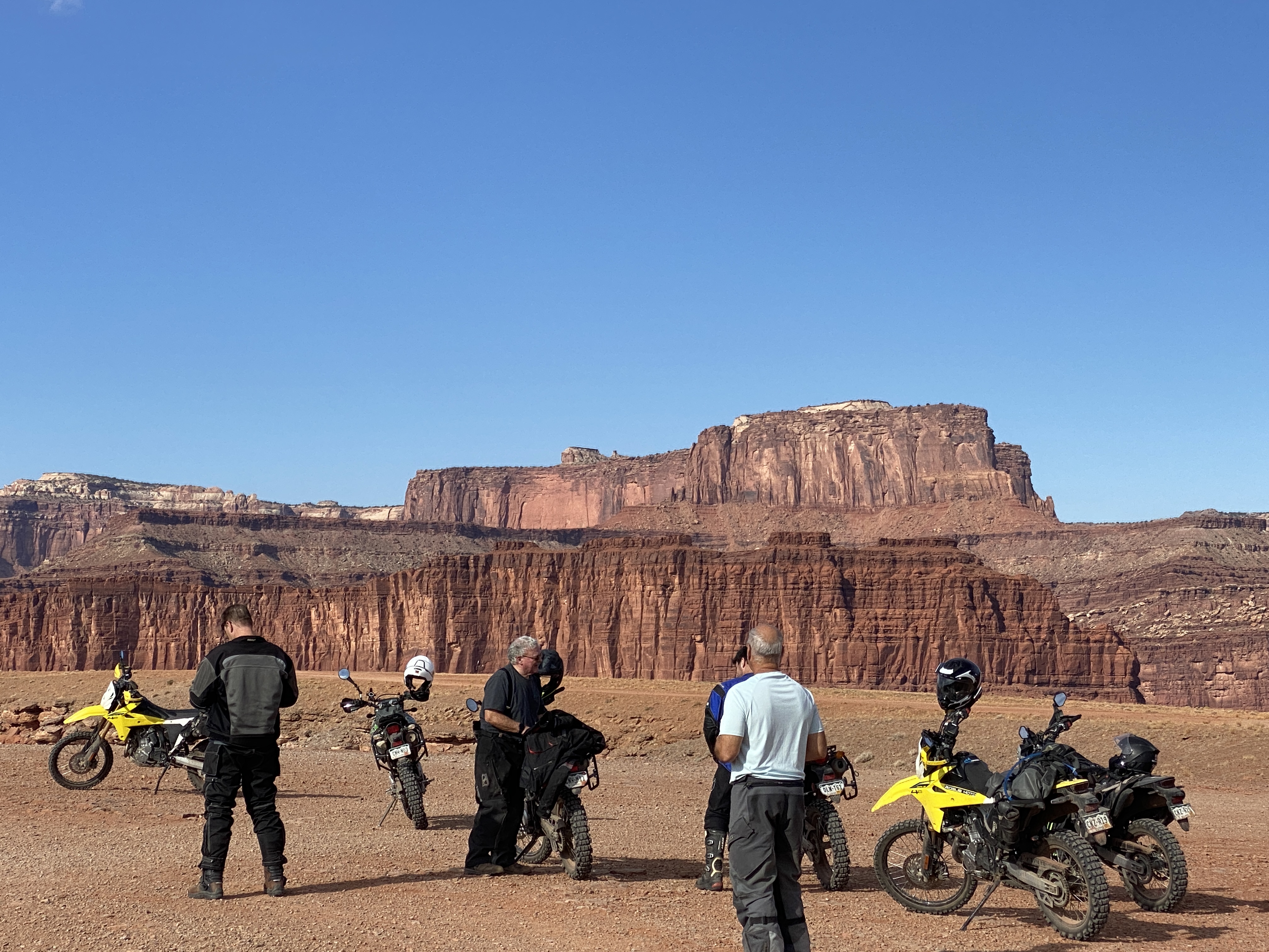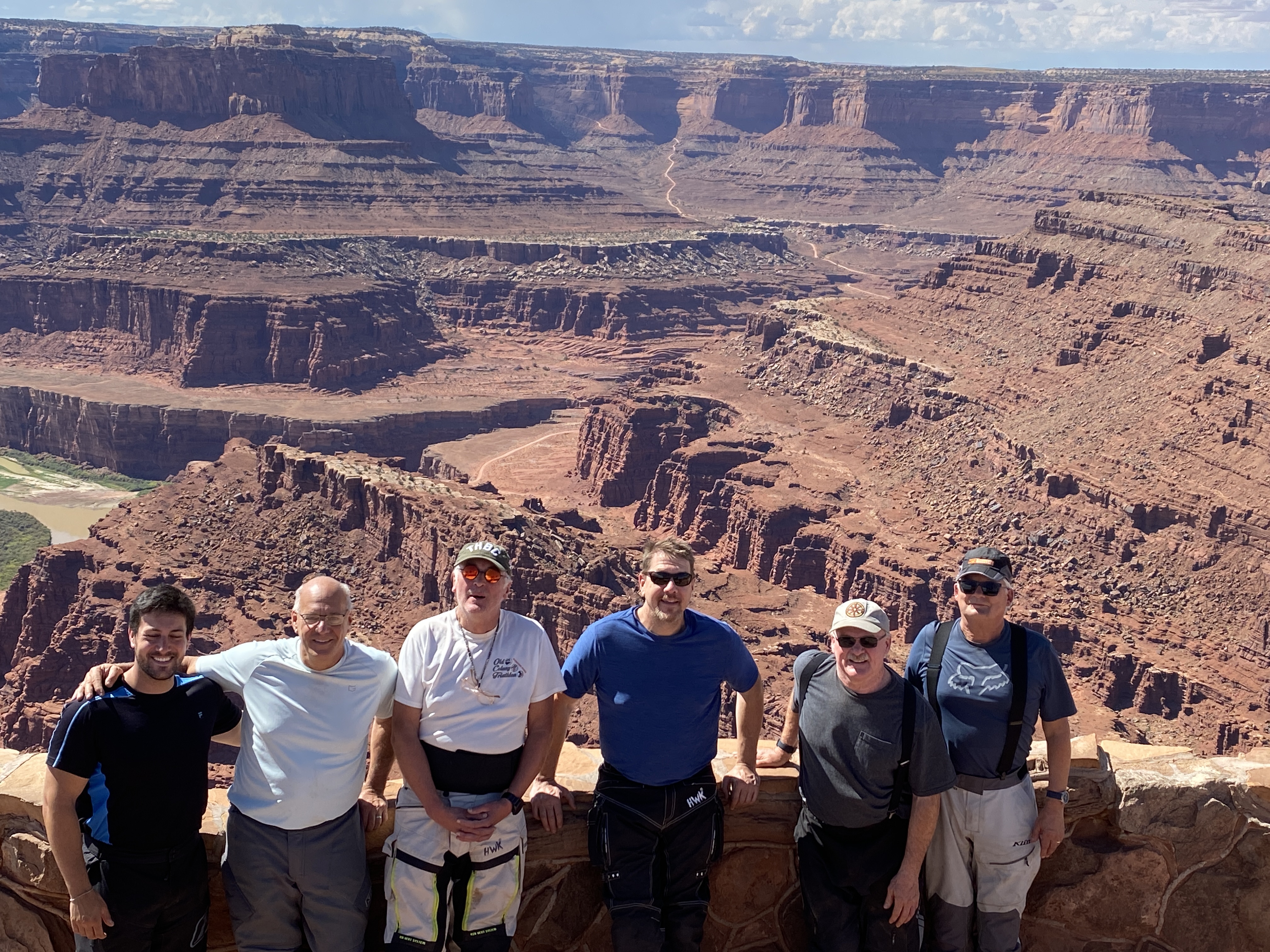 Here is a group photo. That is the Shafer trail in the background. This was an incredible day. Our last day in Moab. Tomorrow we ride to Grand Junction to turn in our motorcycles. Then, Sunday we all fly home.