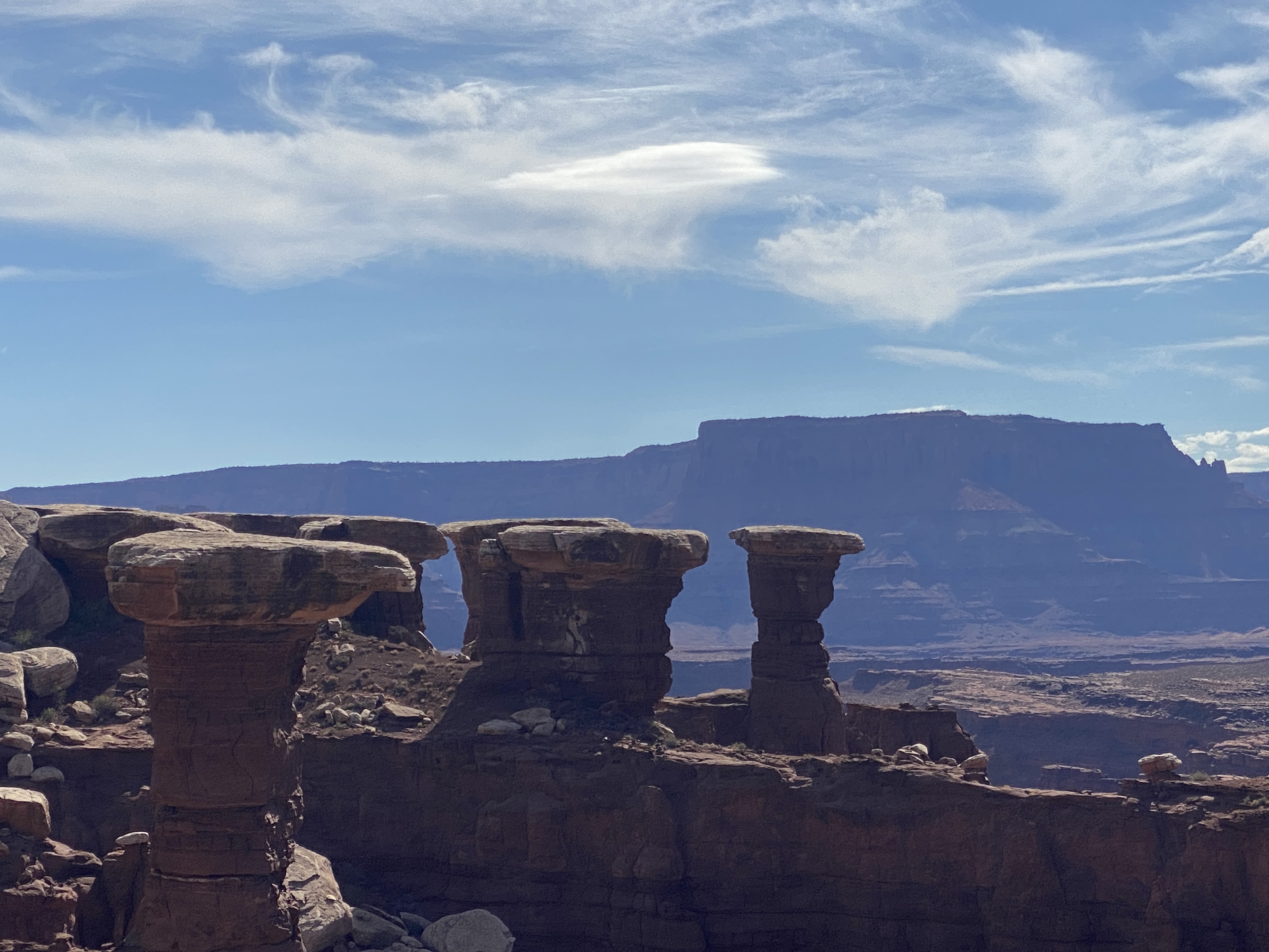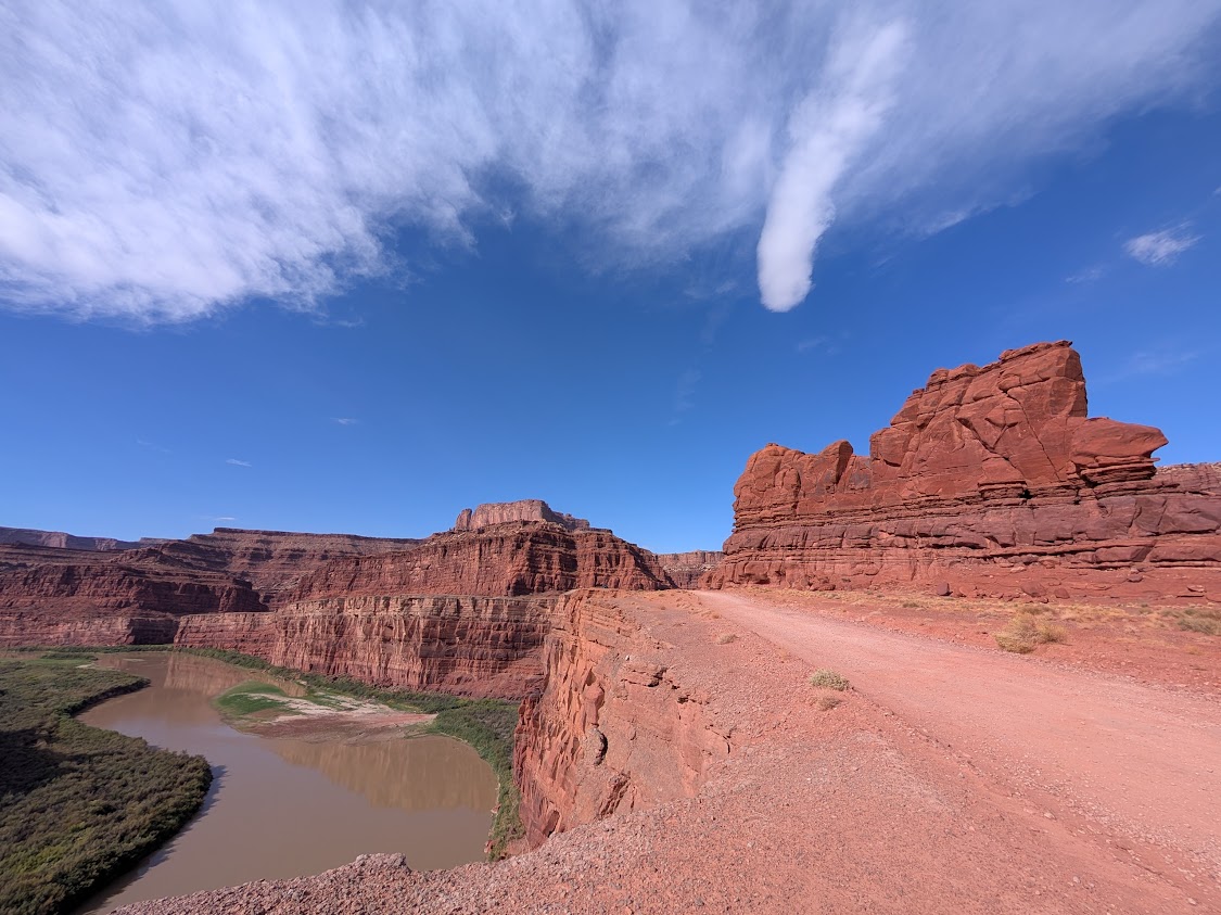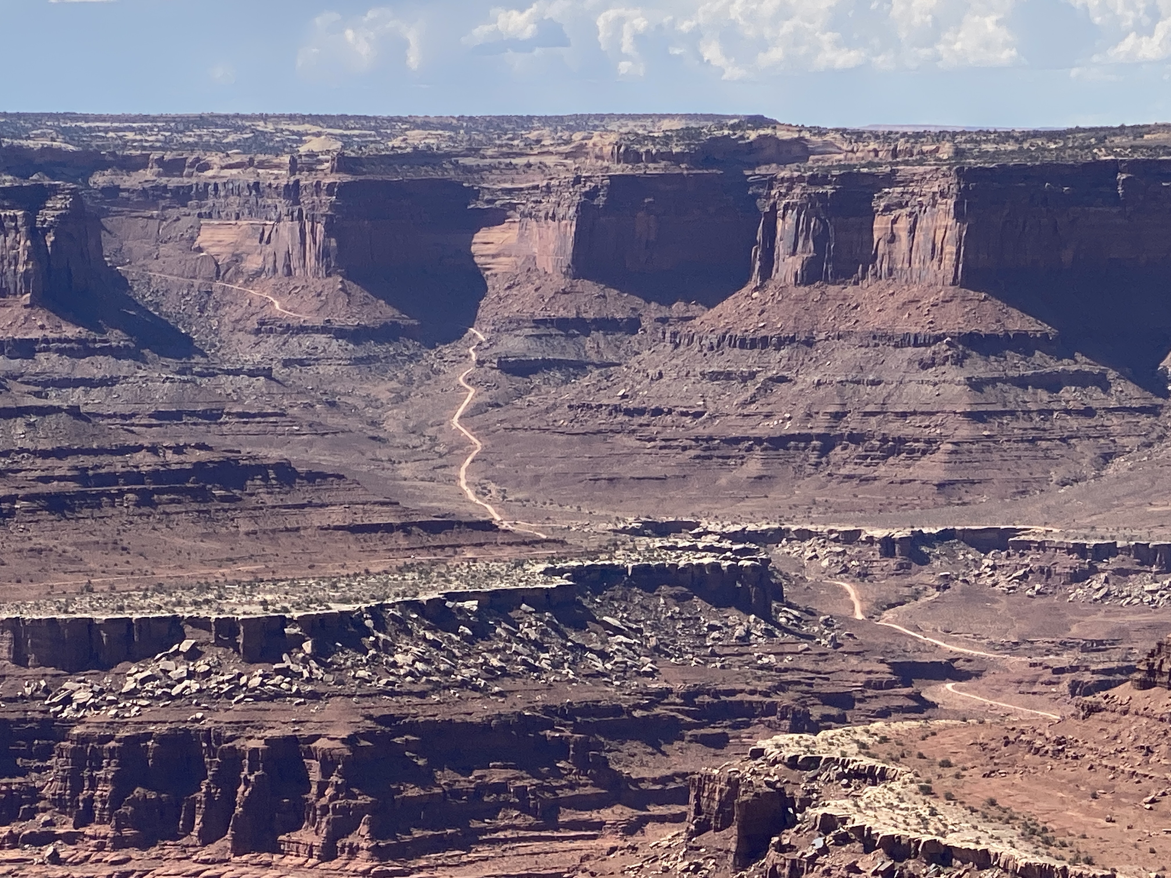 We continued on, climbing until we were on what is called the White Rim Trail. This is named for a layer of white stone which makes almost a natural ledge from the cliff side that the trail follows. The white stone is harder and does not erode as easily as the red stone in the layer above it. Here are some pictures from this part of the ride.