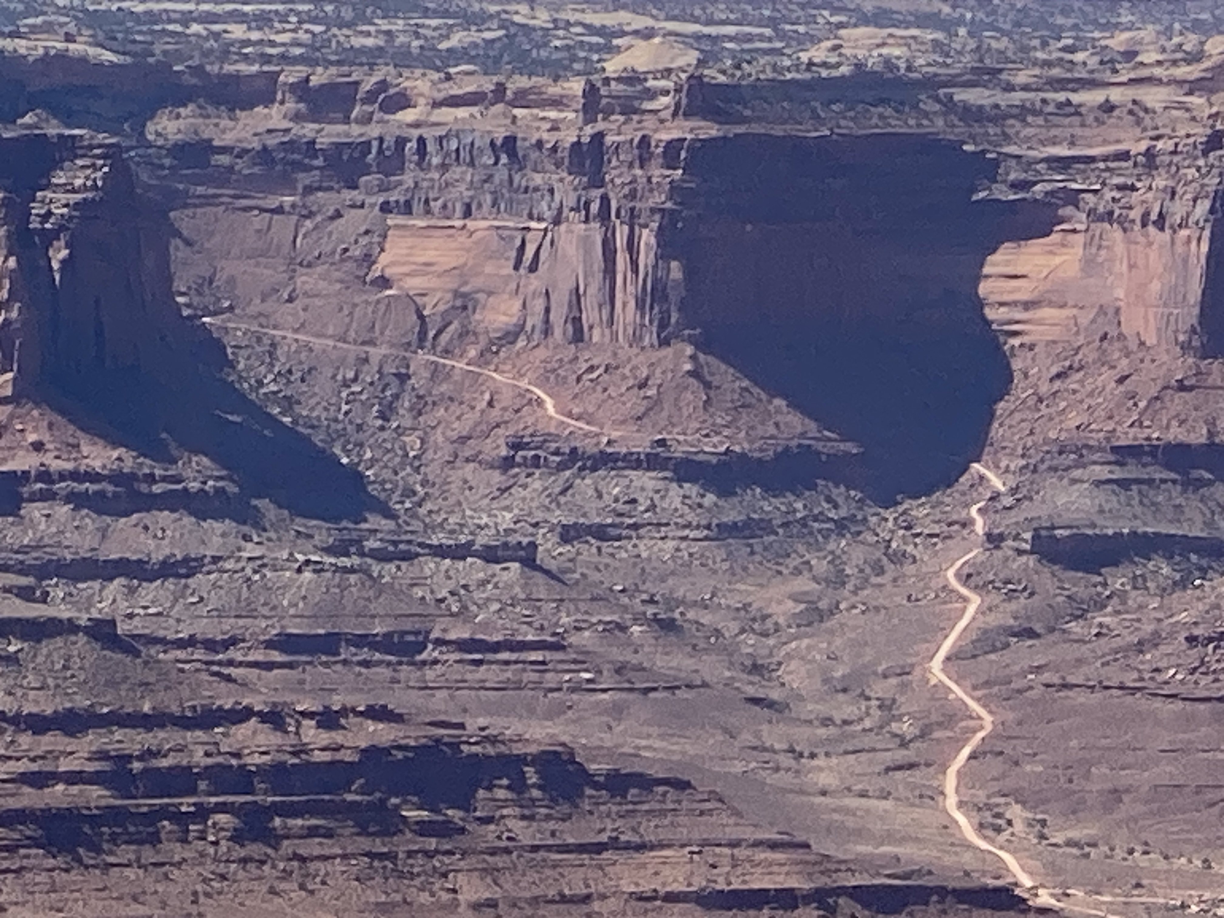 After Mussleman Arch we retraced our way back to the main trail and toward the Schafer Trail. This is a trail originally used by native Americans to get to the top of the mesa. Later it was used by a man named Shafer to move his cattle to the top of the mesa. We could see it off in the distance, as shown by these two pics, more or less meandering towards the cliffs, then a series of switchbacks to climb to the top of the mesa.