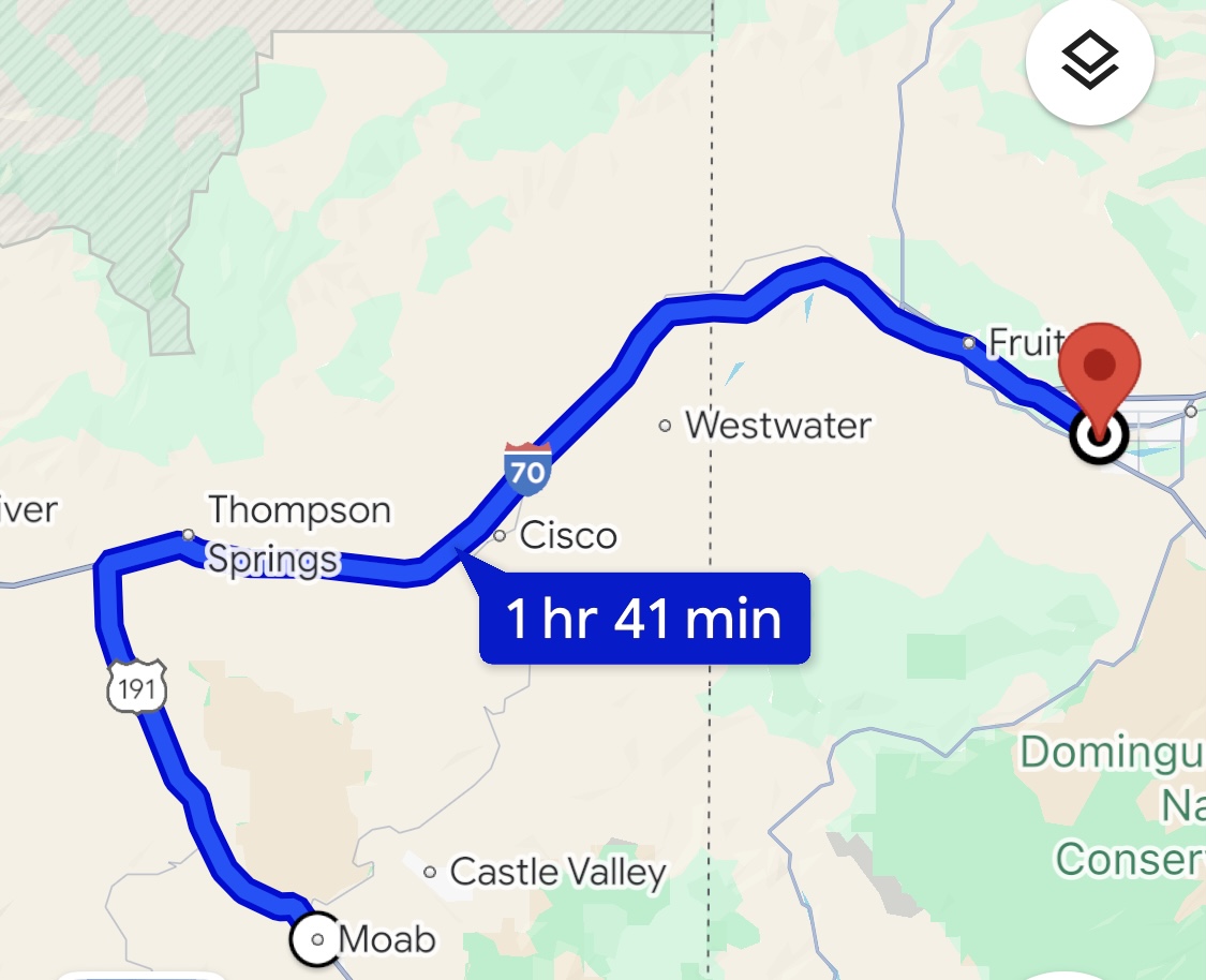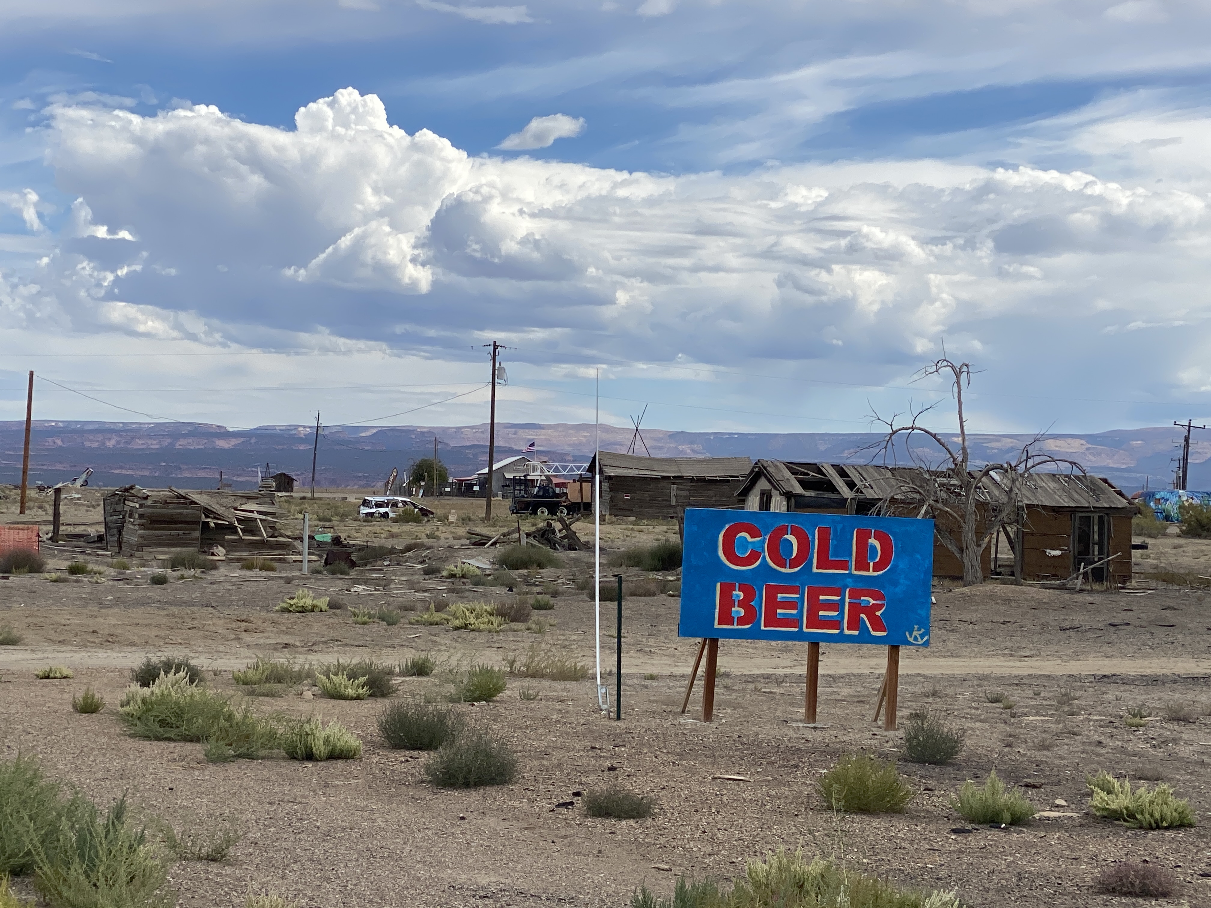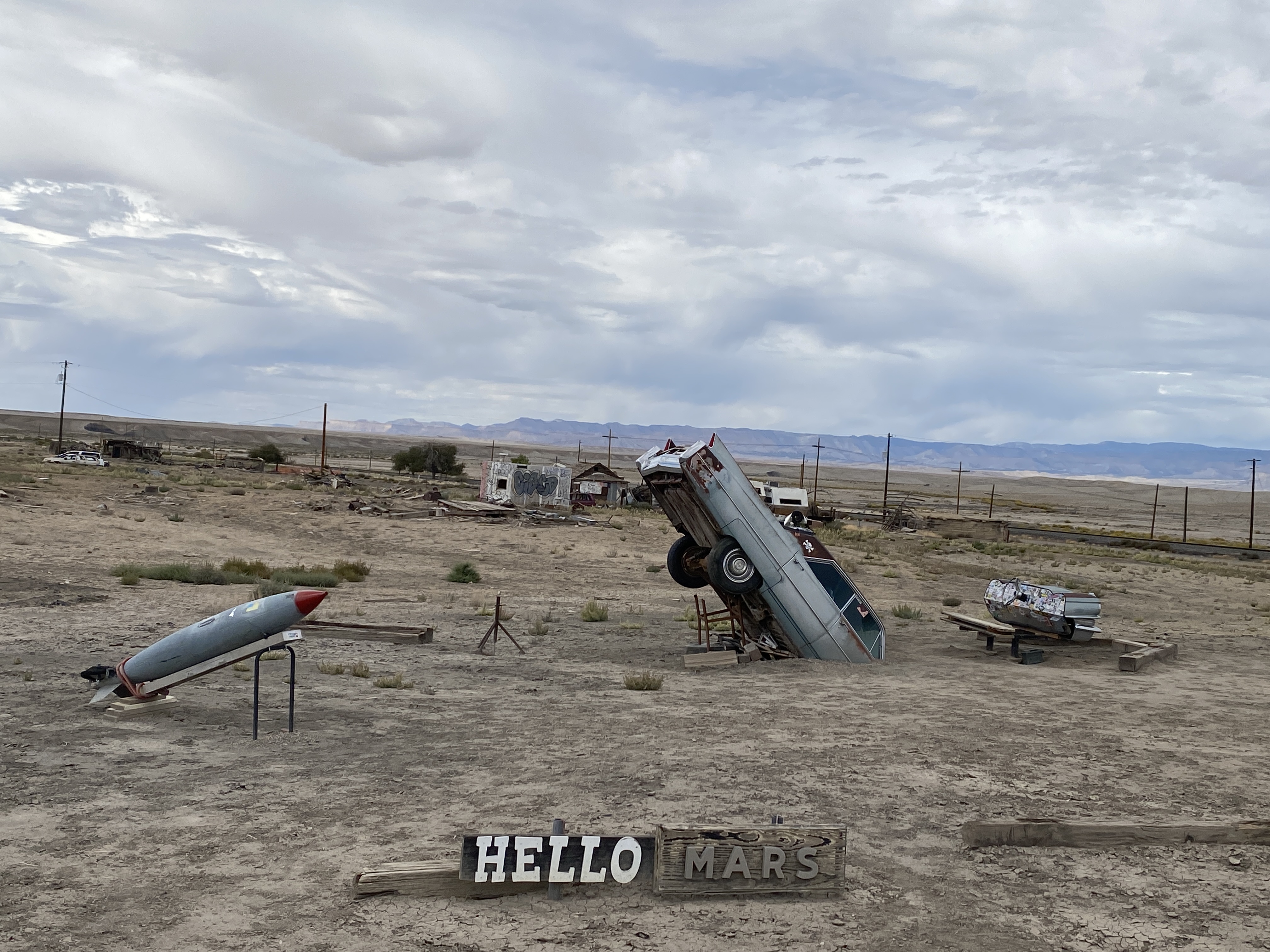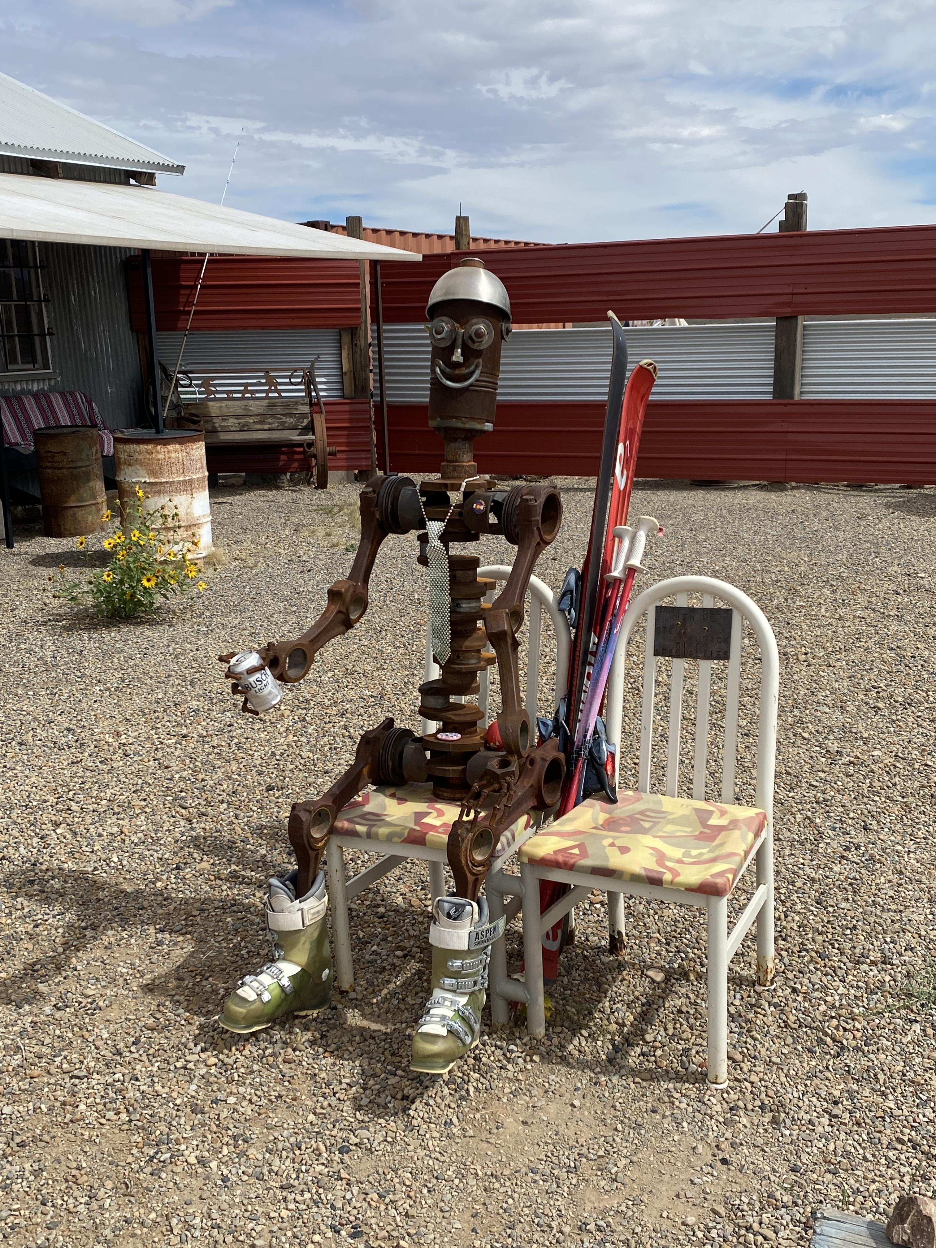 After our morning out and back ride we gassed up in Moab and headed to Grand Junction. The map says an hour and 40 minutes via interstate. We did it via back roads as much as possible, and the trip took a bit over three hours. We stopped at the town of Cisco. Almost all the buildings are now ruins. There is a general store that sells souvenirs, many of them Thelma and Louise themed. Most importantly for us is they had a freezer with ice cream. So be we took an ice cream break. There are also various sculptures etc such as a Caddiliack buried in the ground next to a small rocket and a welded up robot sitting in a chair.