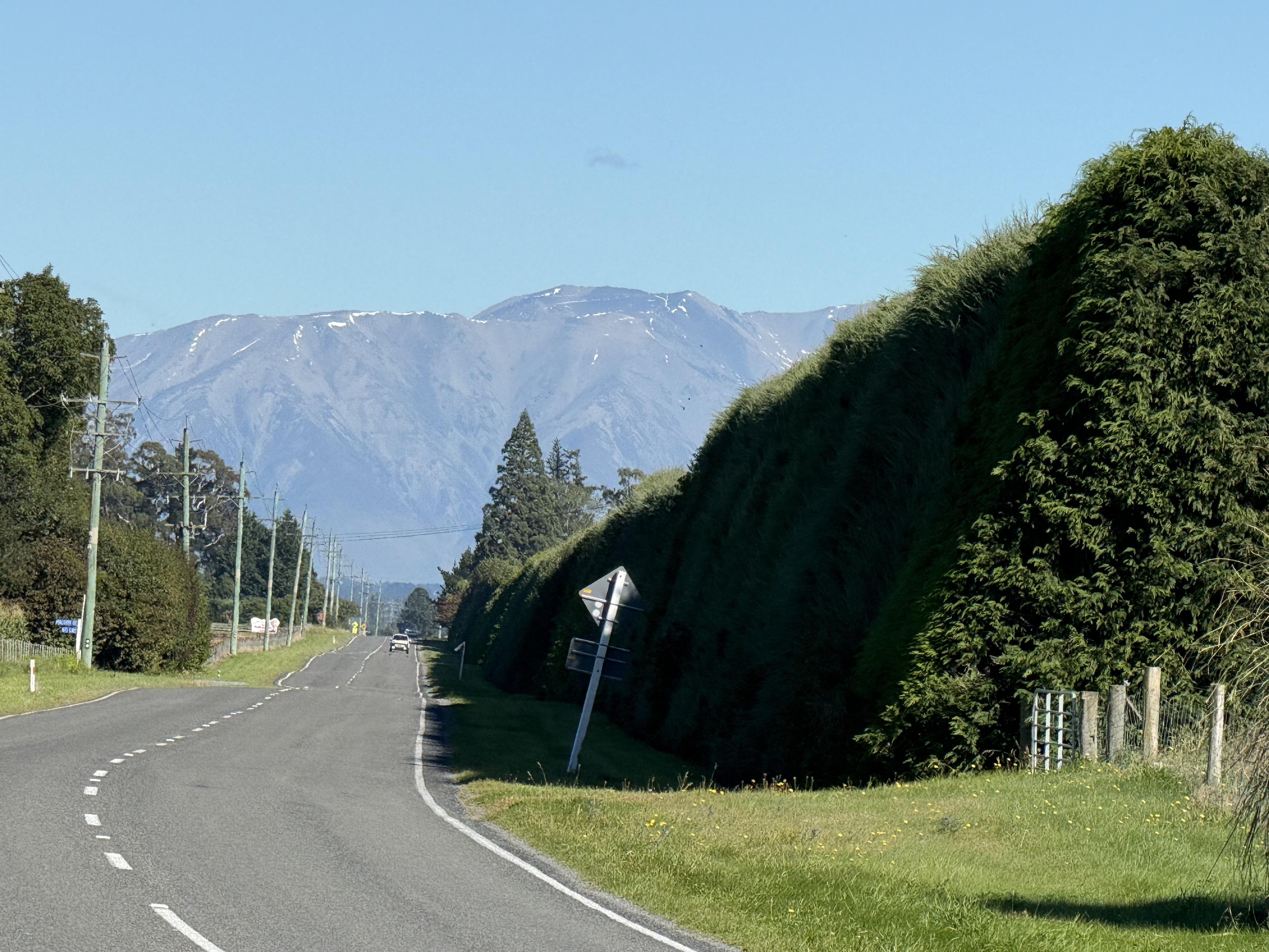Today we headed out with all our luggage stored in the panniers on our motorcycles. If you look at the map above you see a long relatively straight road. It goes through incredibly well maintained farms. An interesting feature are tall hedges of trees around all the fields. These are wind breaks. They are often 40 to 50 or more feet tall. They are also usually trimmed way up. We would ride along the road with a tall hedge beside us. Here is a picture of a hedge. They were generally taller than this one.