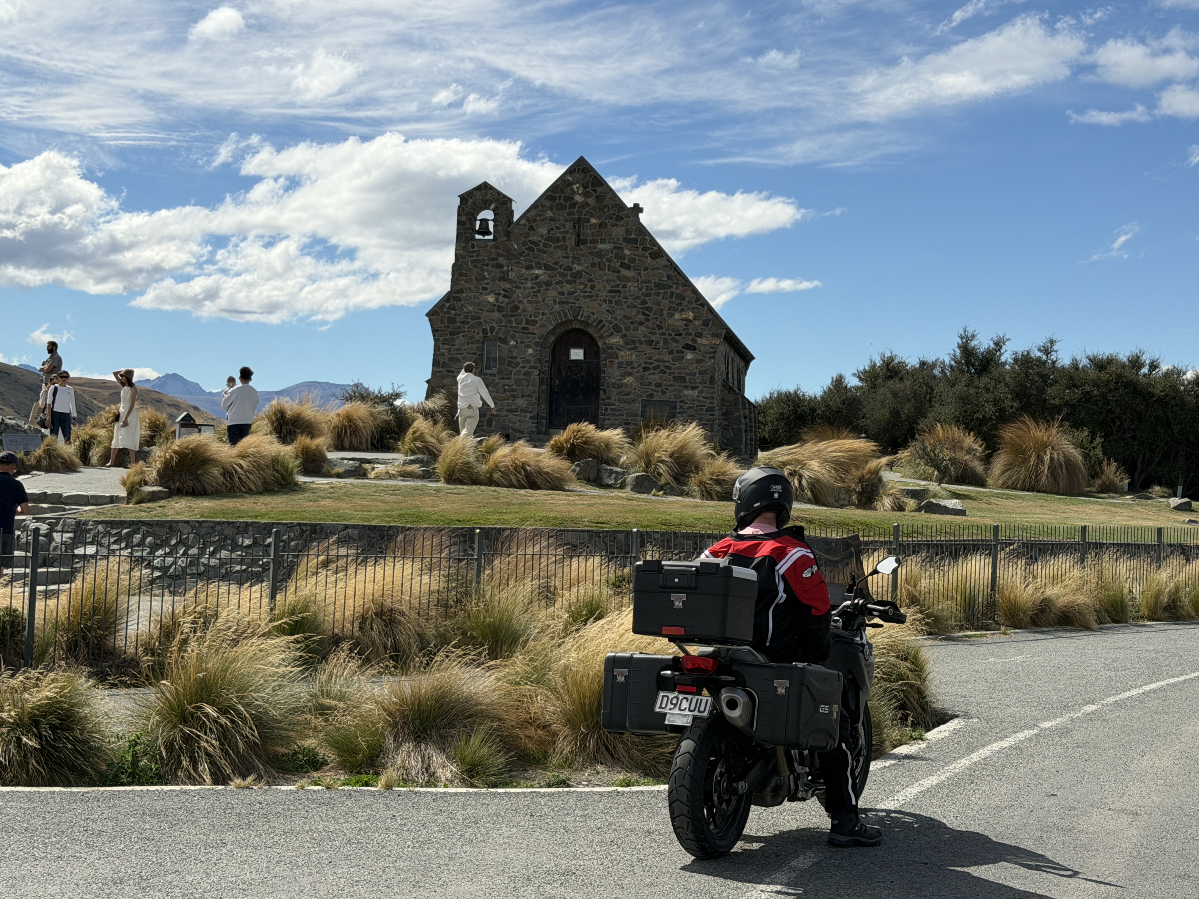 We stopped at an outdoor cafe in the town of Geraldine. After that we began climbing and headed towards the Mt Cook area. We stopped for gas in a small town called Twizel, where we also saw this small church by the lake.