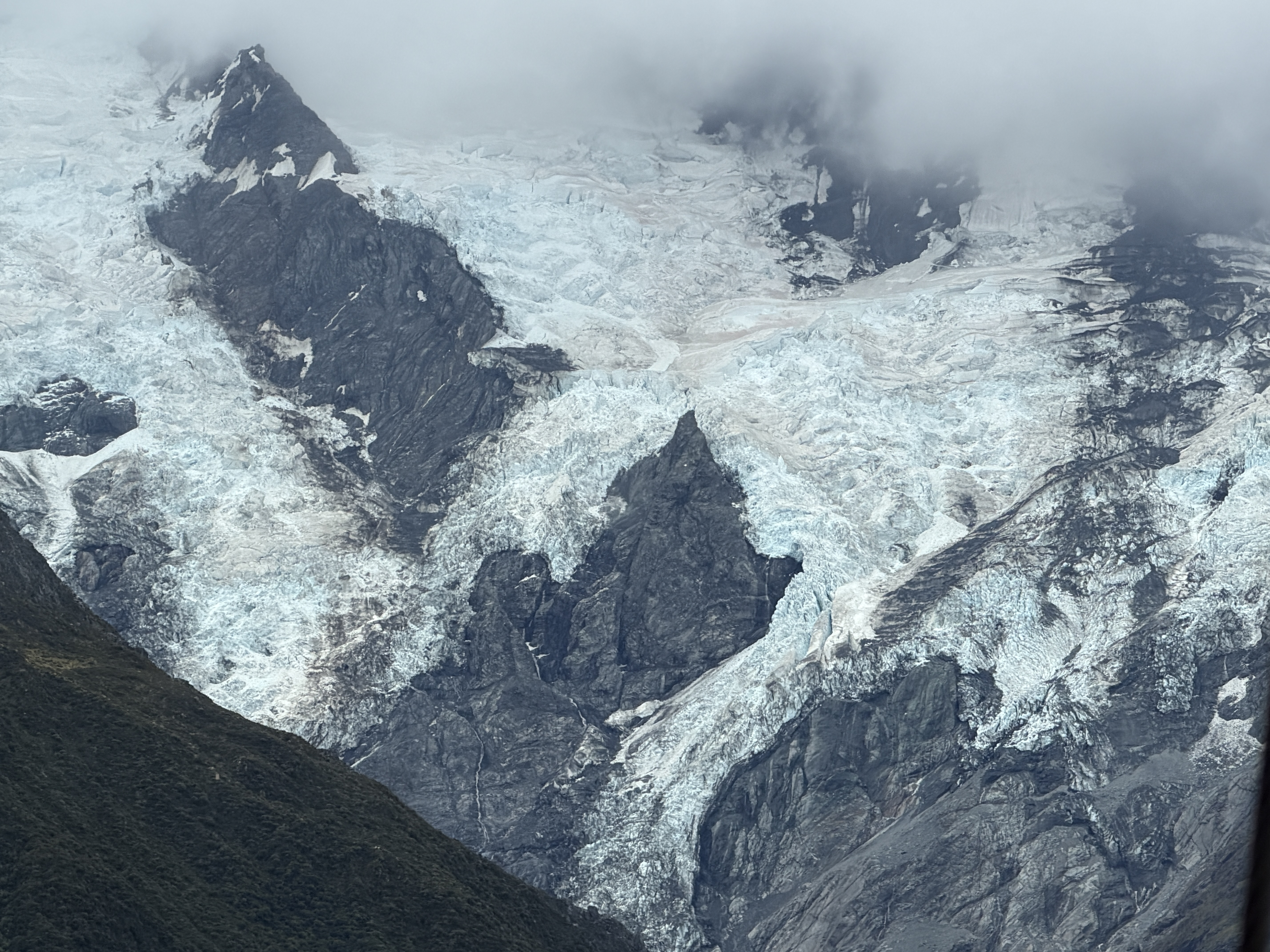There are a lot of sheep in New Zealand. They are also very friendly. A bit later we arrived at Mt Cook. It rises up right out of the grassy broad valley. The villiage is only about 2,500 feet elevation. The peak is a bit over 12,000 feet. It feels like you can just reach out and touch it.