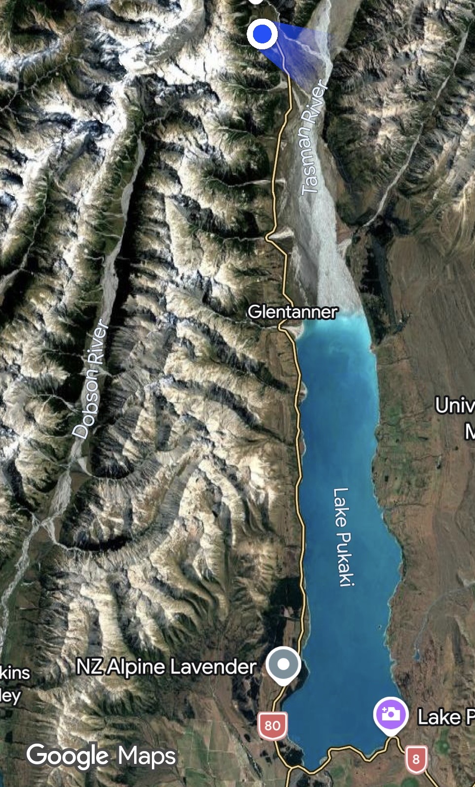 In the map below you can see lake Pukaki which is fed by the Tasman River, which in turn is fed by the glacier on Mt Cook. The blue dot at the top is Mt Cook Villiage where we will be spending the night in the Mt Cook Hotel.